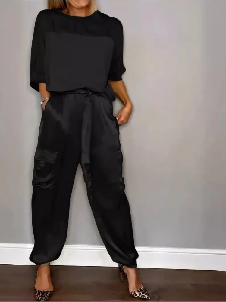 6 reviews for 2024 Spring Women’s New Fashionable Smooth Satin Half Sleeve Top With Strap Pants Pocket Set Half Sleeve Pants Two Piece Set