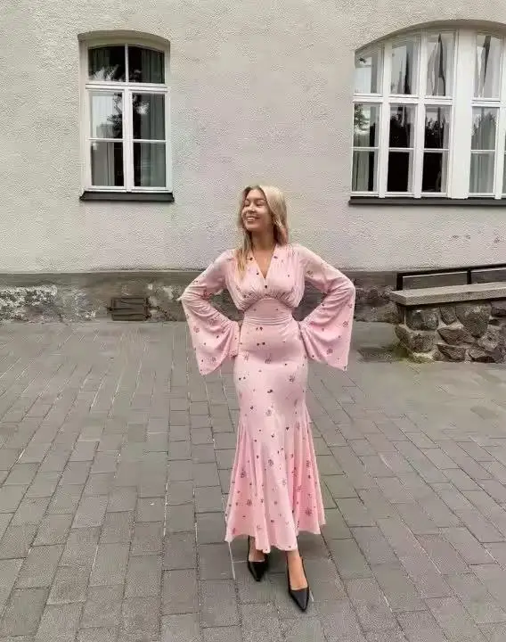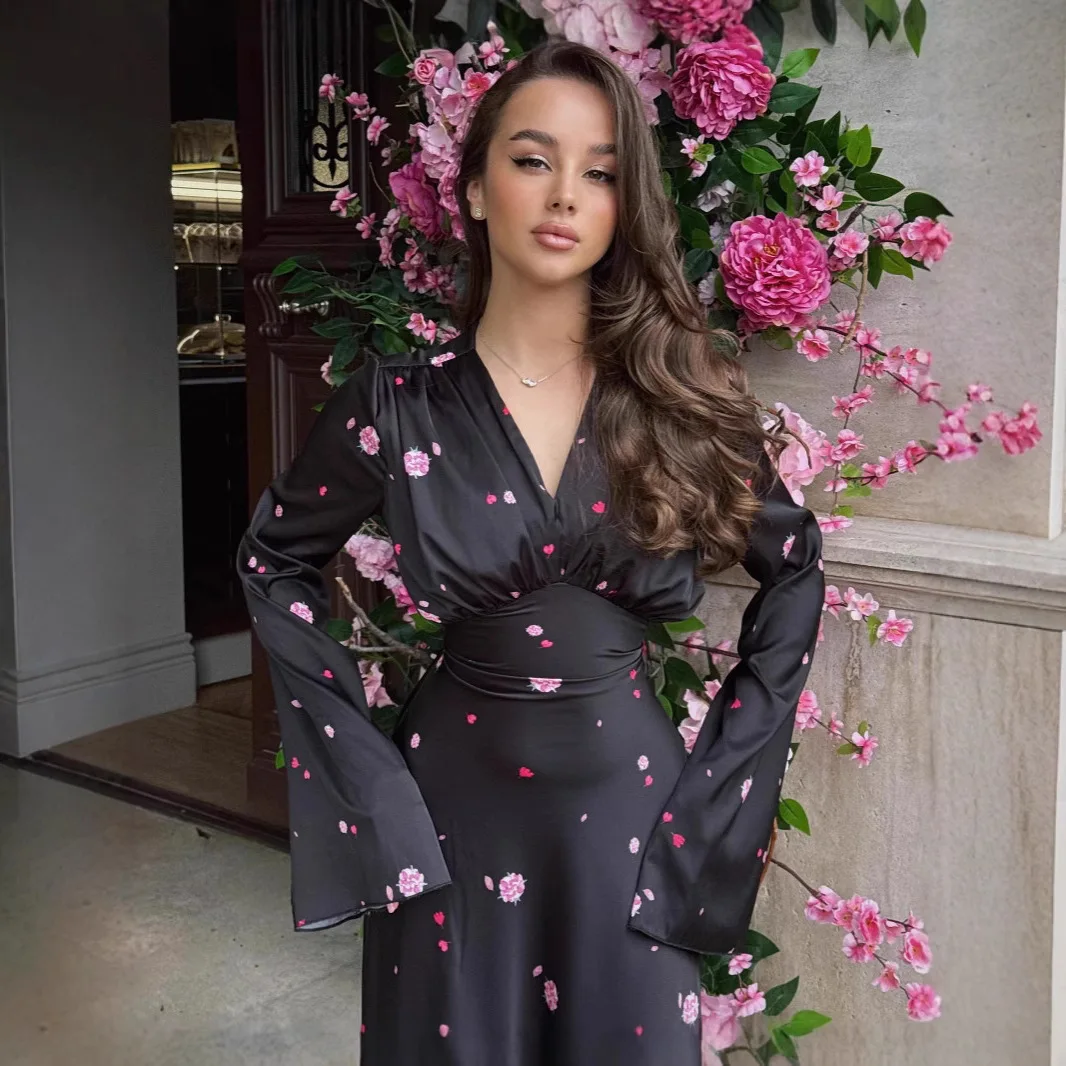 2025 Autumn Elegant Printed Satin Long Dress Women Slim Lace Up V-neck Full Sleeve Pleat Dresses Lady Party Evening Robes New