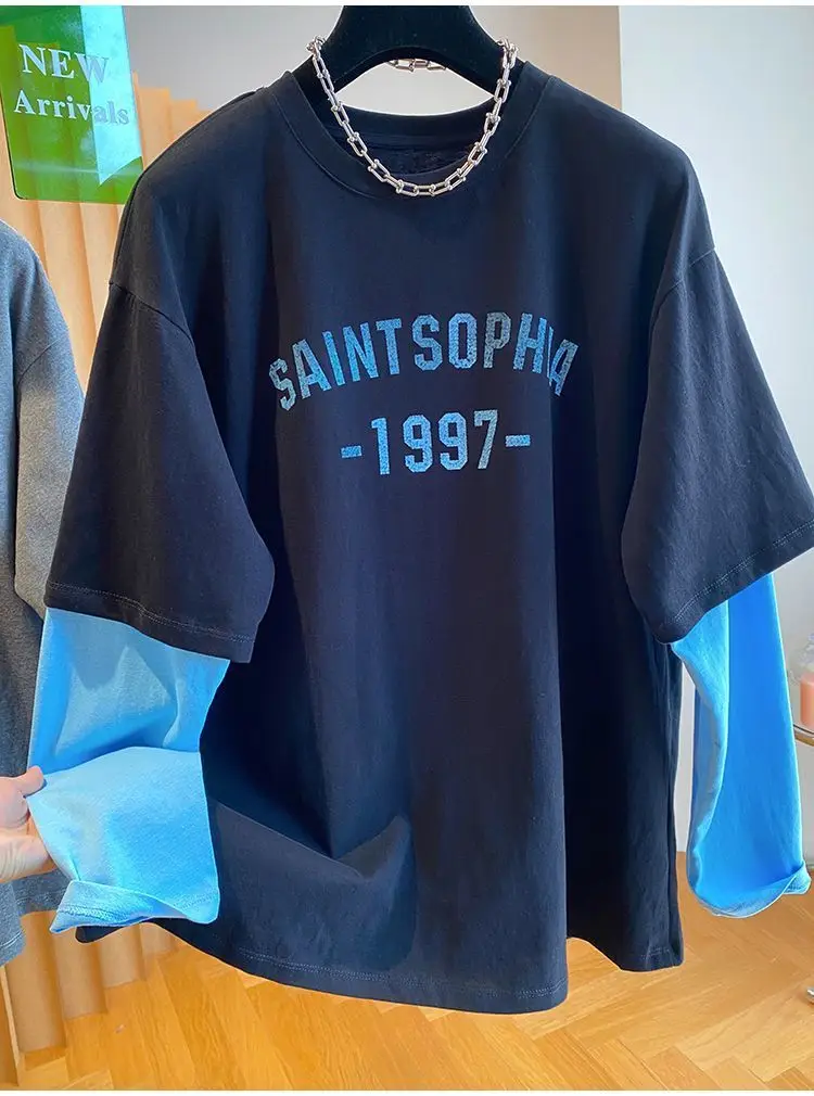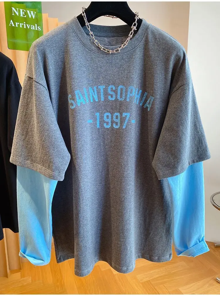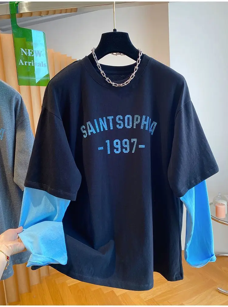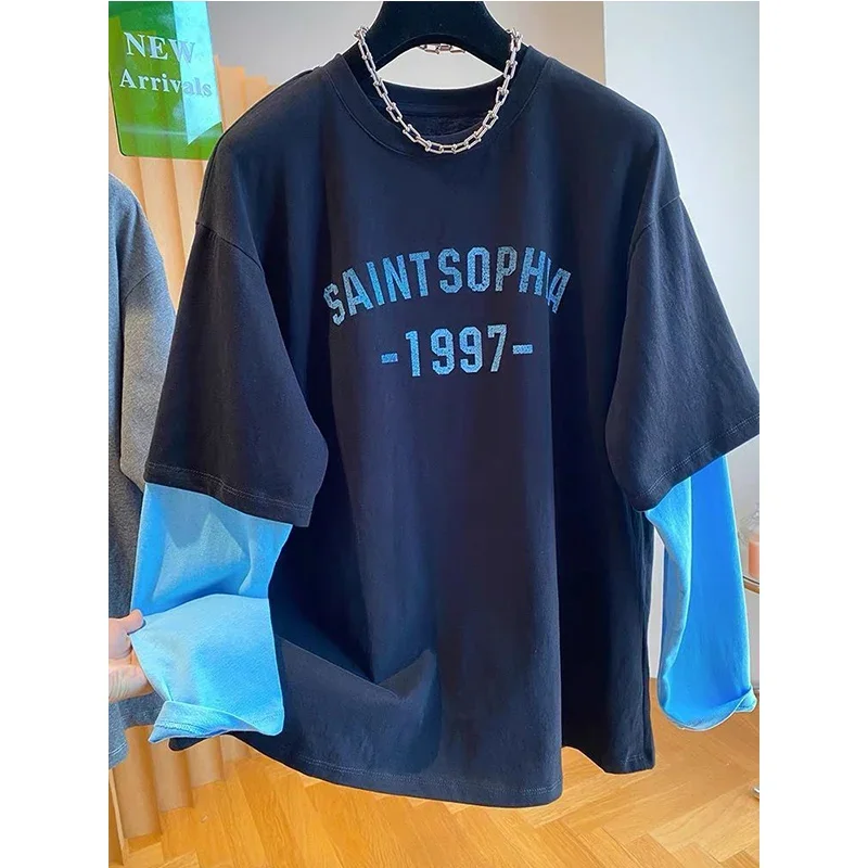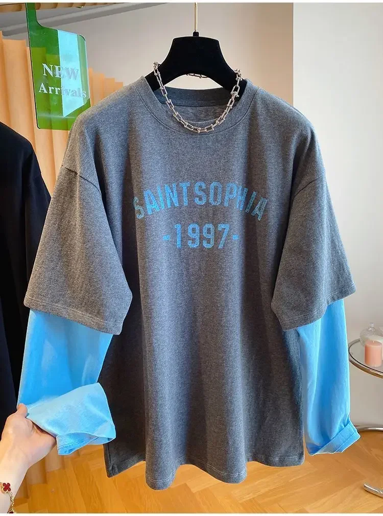 Autumn Oversized Women Clothing All-match Patchwork Fake Two Pieces Female Casual Letter O-neck T-Shirts Femme Top Tee