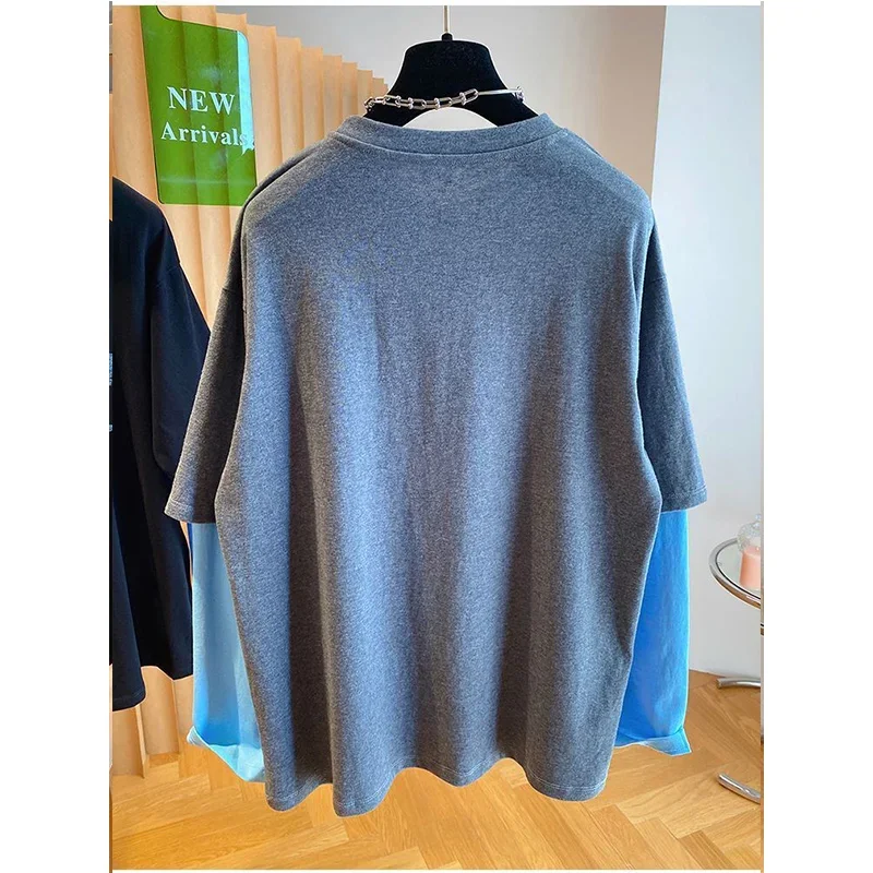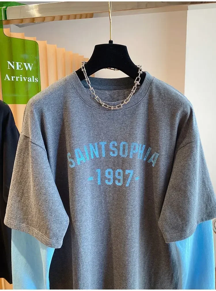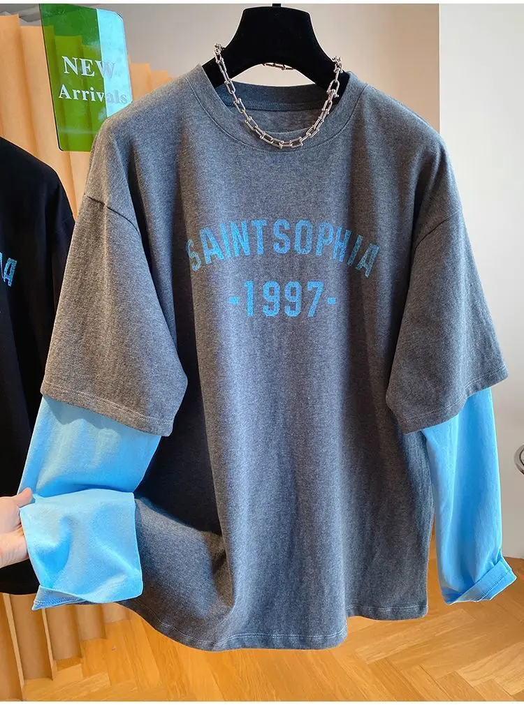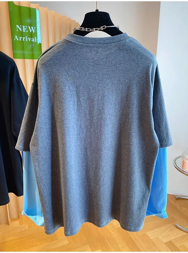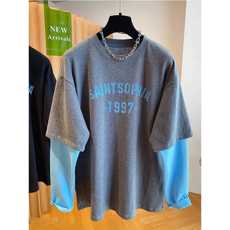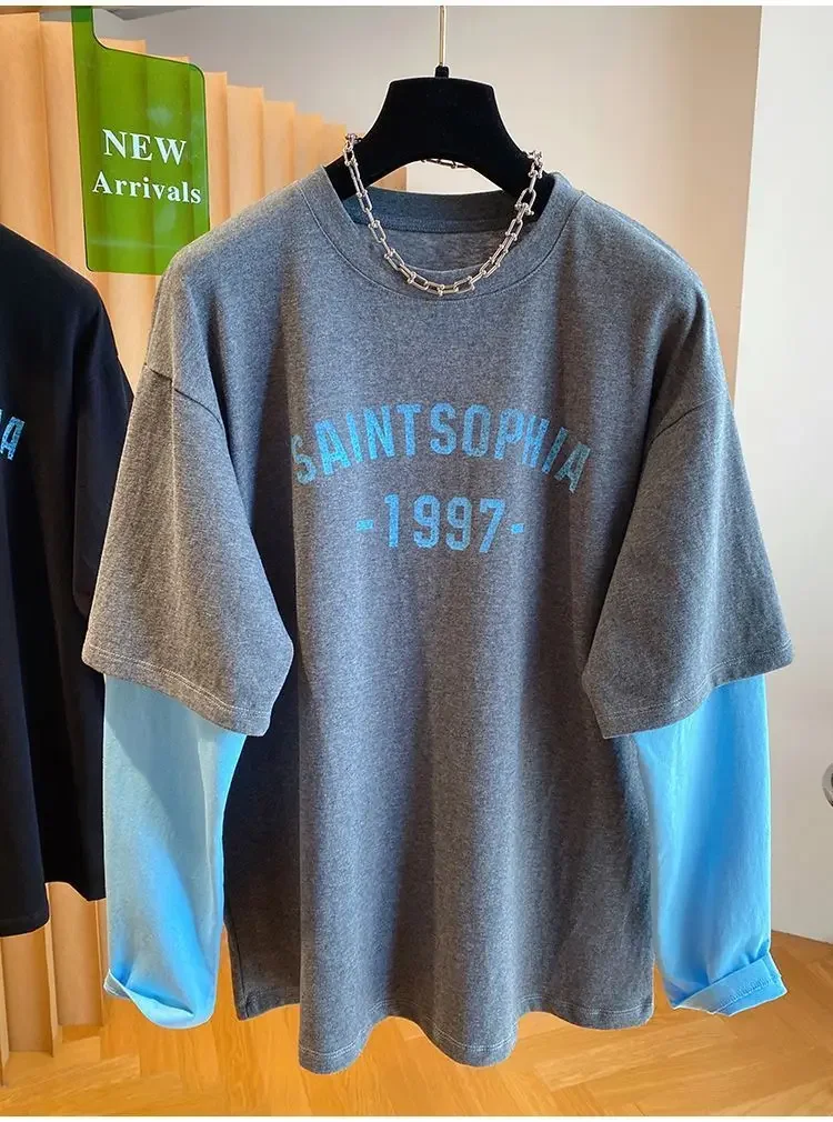 Autumn Oversized Women Clothing All-match Patchwork Fake Two Pieces Female Casual Letter O-neck T-Shirts Femme Top Tee