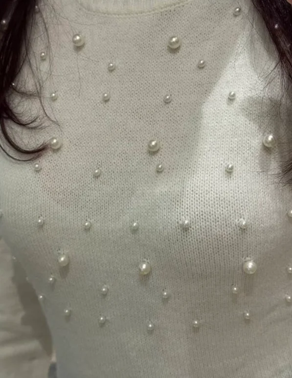 1 review for 2025 Autumn Women Sweater Dresses Pearls Round Neck Long Sleeve Hip Wrap Dress Winter Elegant Ladies Casual Solid Slim Fit Dress