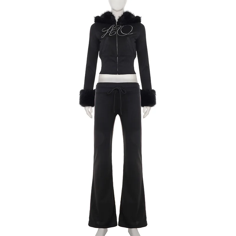 2025 Fall Winter Diamonds Letter 2 Piece Set Tracksuits Furry Patchwork Long Sleeve Zipper Hooded Jackets Top + Flare Pants Suit