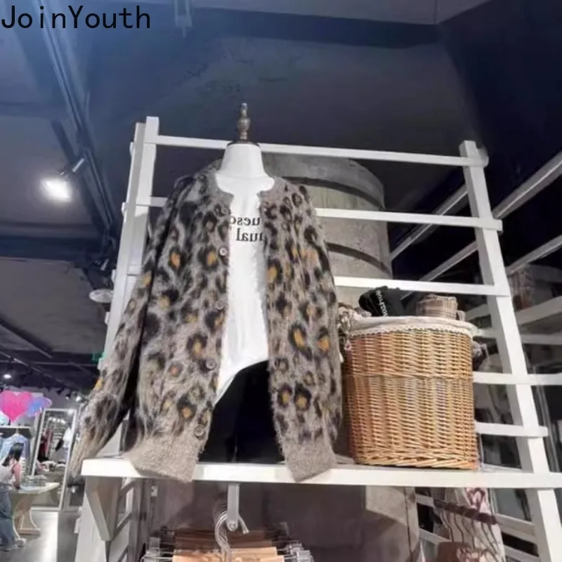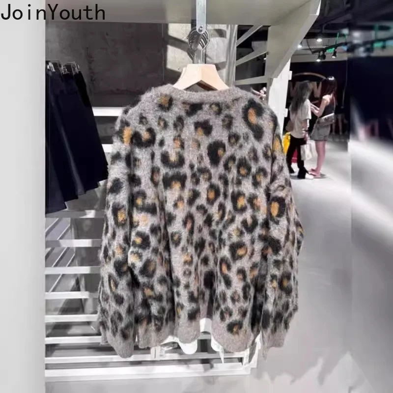 2025 Women Clothing Leopard Knitted Cardigan Women Sueter Mujer Korean Chic Pull Femme O-neck Casual Fashion Oversized Sweater