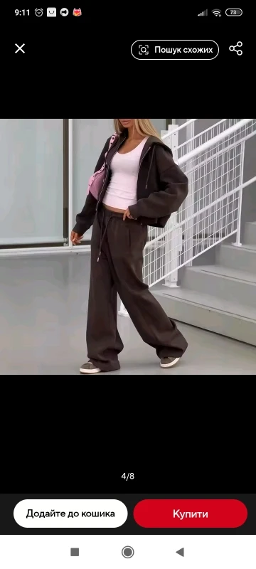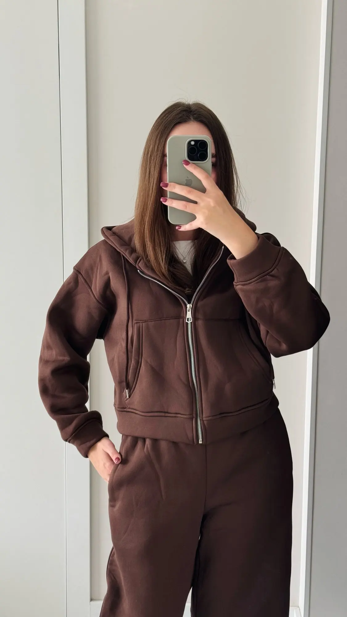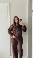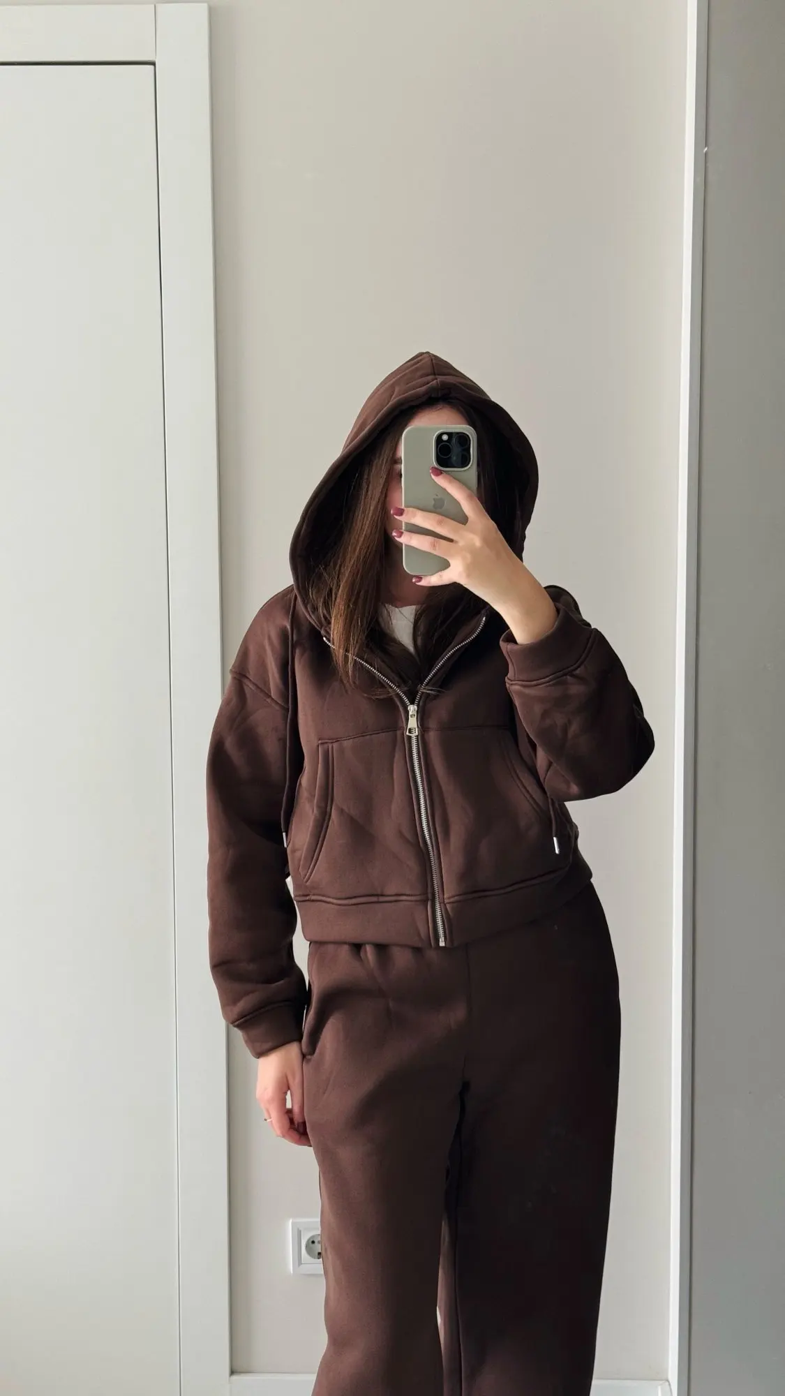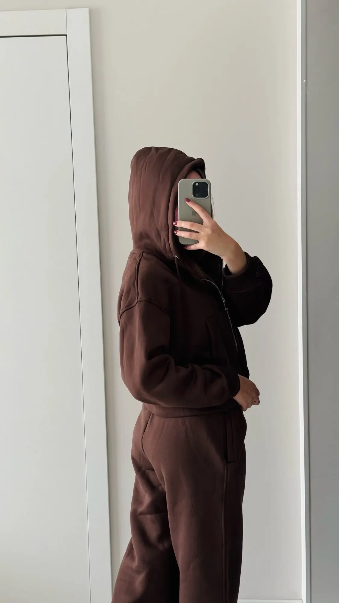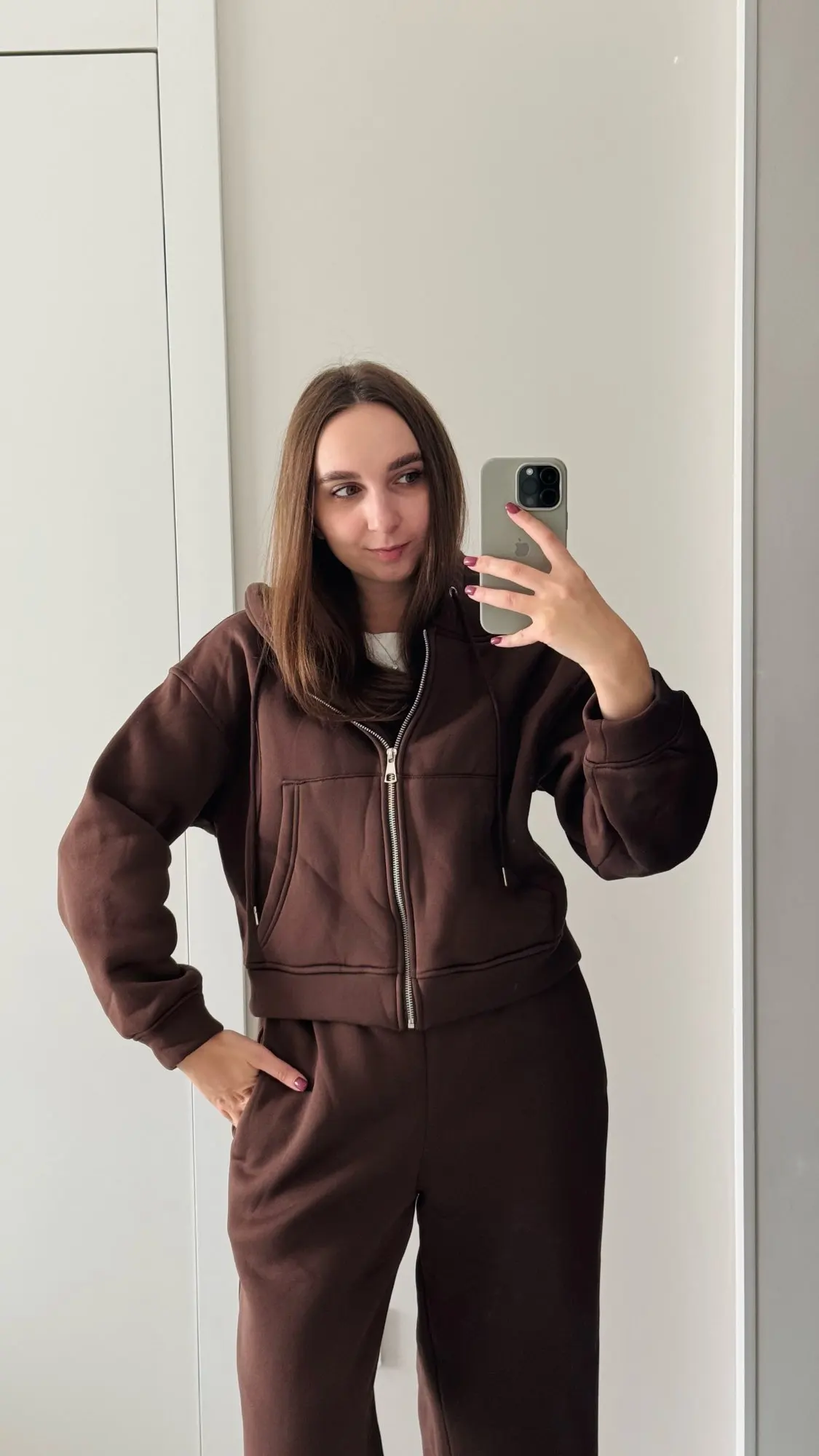 Received the suit and had mixed feelings. The suit matches the seller’s photo, the color is nice, such a smoky brown, I wear size M so that’s what I took, it’s quite loose, but if it were smaller, the sleeves would be shorter. The suit is fleece. The fabric says it’s 65% cotton, the rest is polyester, although cotton doesn’t feel at all to the touch.