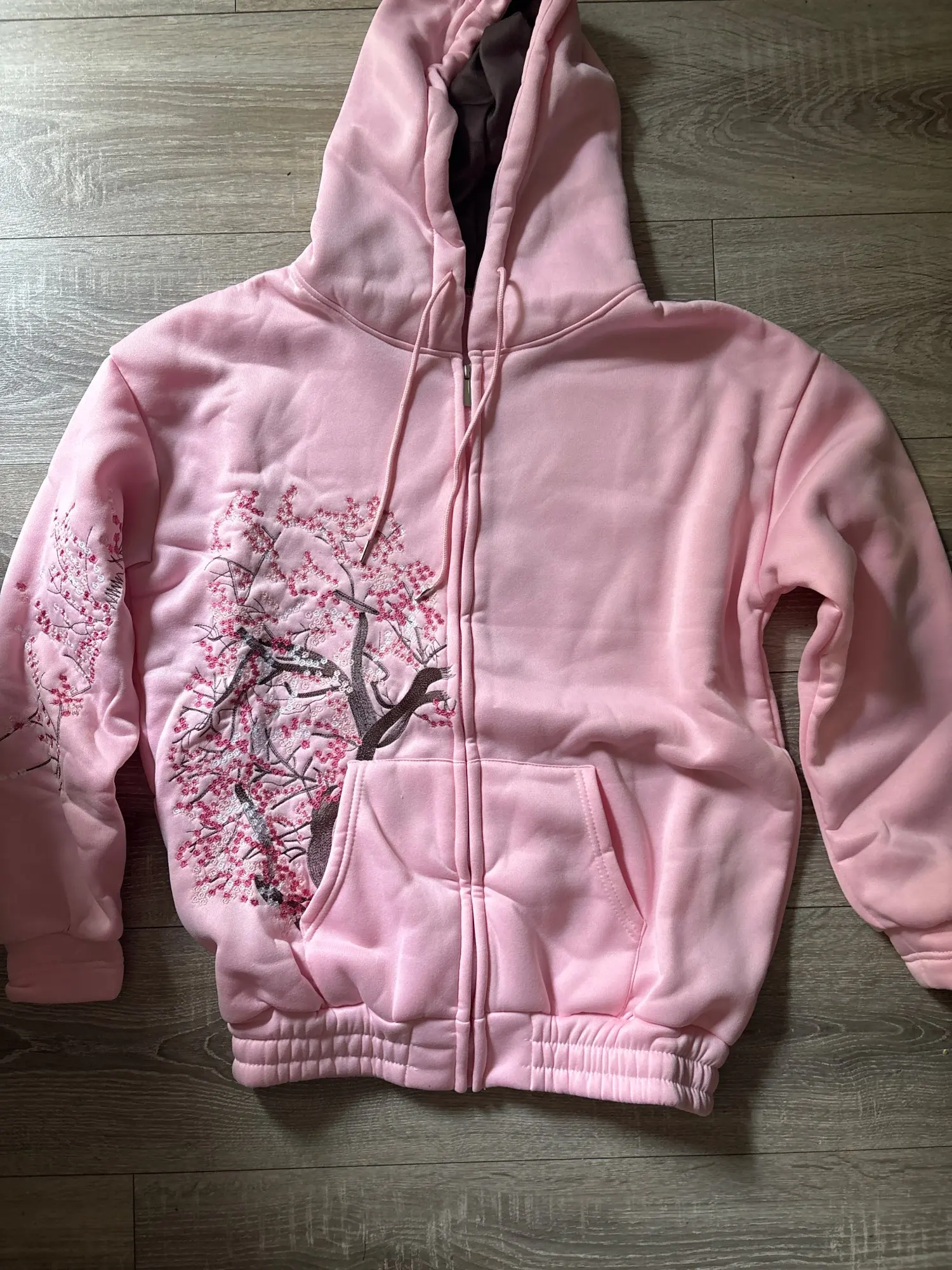 I’m actually going to post a review with photos, u like some people i don’t know what’s so hard. The blossom embroidery is small and not like the picture, based on what i know it’s actually supposed to be a jacket but it’s a polyester zip up hoodie still cute not what i expected though. But the shipping was quite fast.