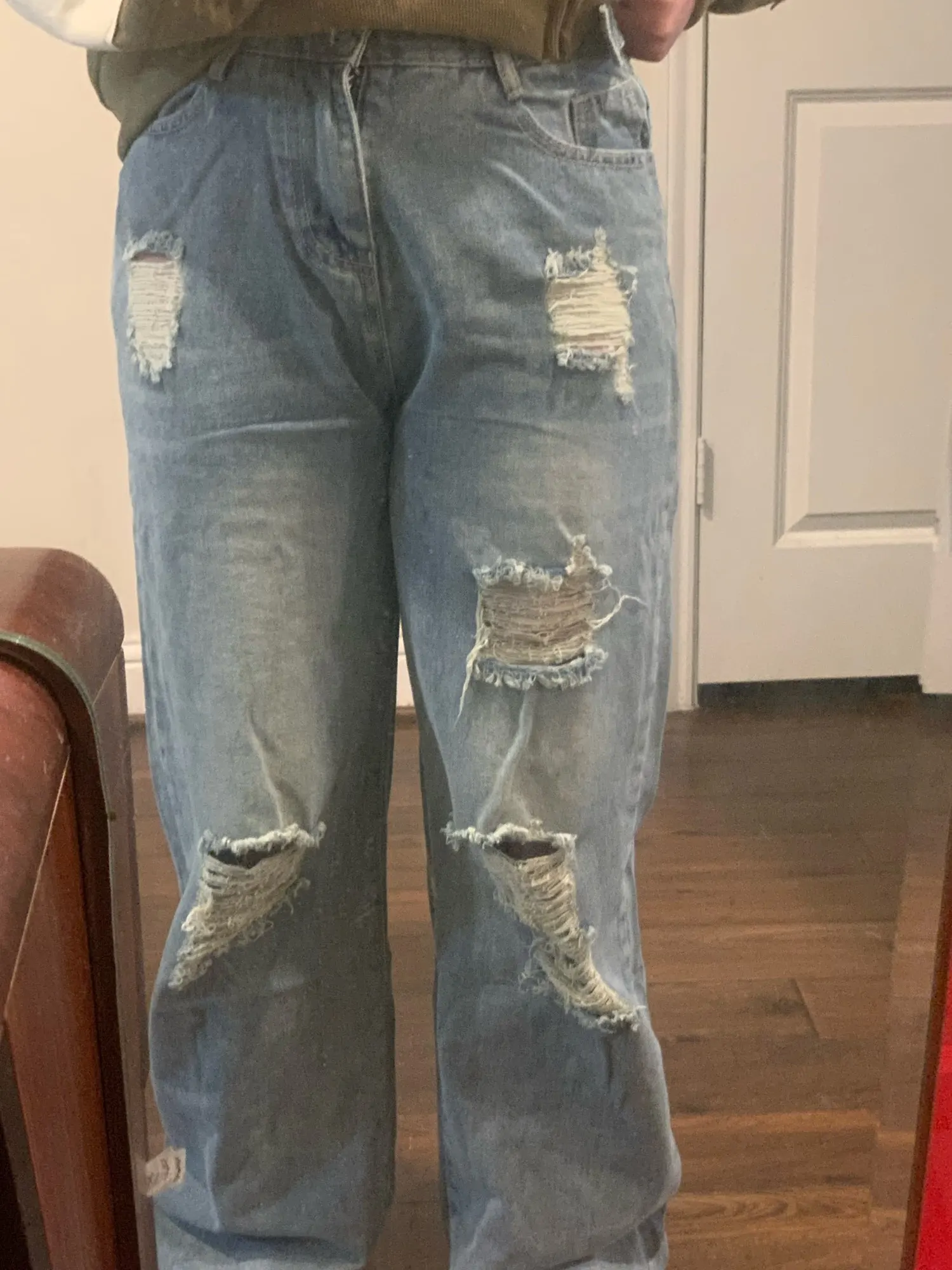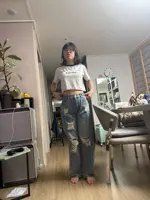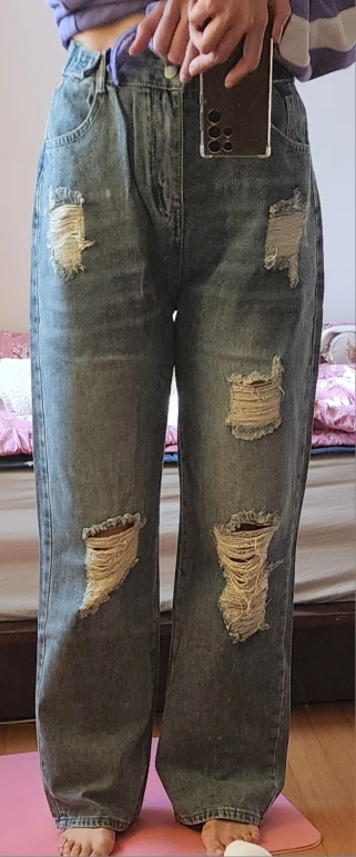 The waist is tighter than I thought. It’s not that I’ve gained weight; it’s just a bit snug. Still wearable though, so I’ll just lose weight. And there’s something on the side that can adjust the waist if it’s too tight. I was really impressed when I saw that. The length was just right, and the color and everything else are really nice. The fit is also nice. And the best part is that there’s almost no smell of new jeans like the first pair I bought. So it’s okay to wear it right away without washing it once. This is my first time buying clothes from Ali, and it was a great success. Oh, and just so you know, since it’s denim, there’s no stretch.