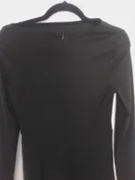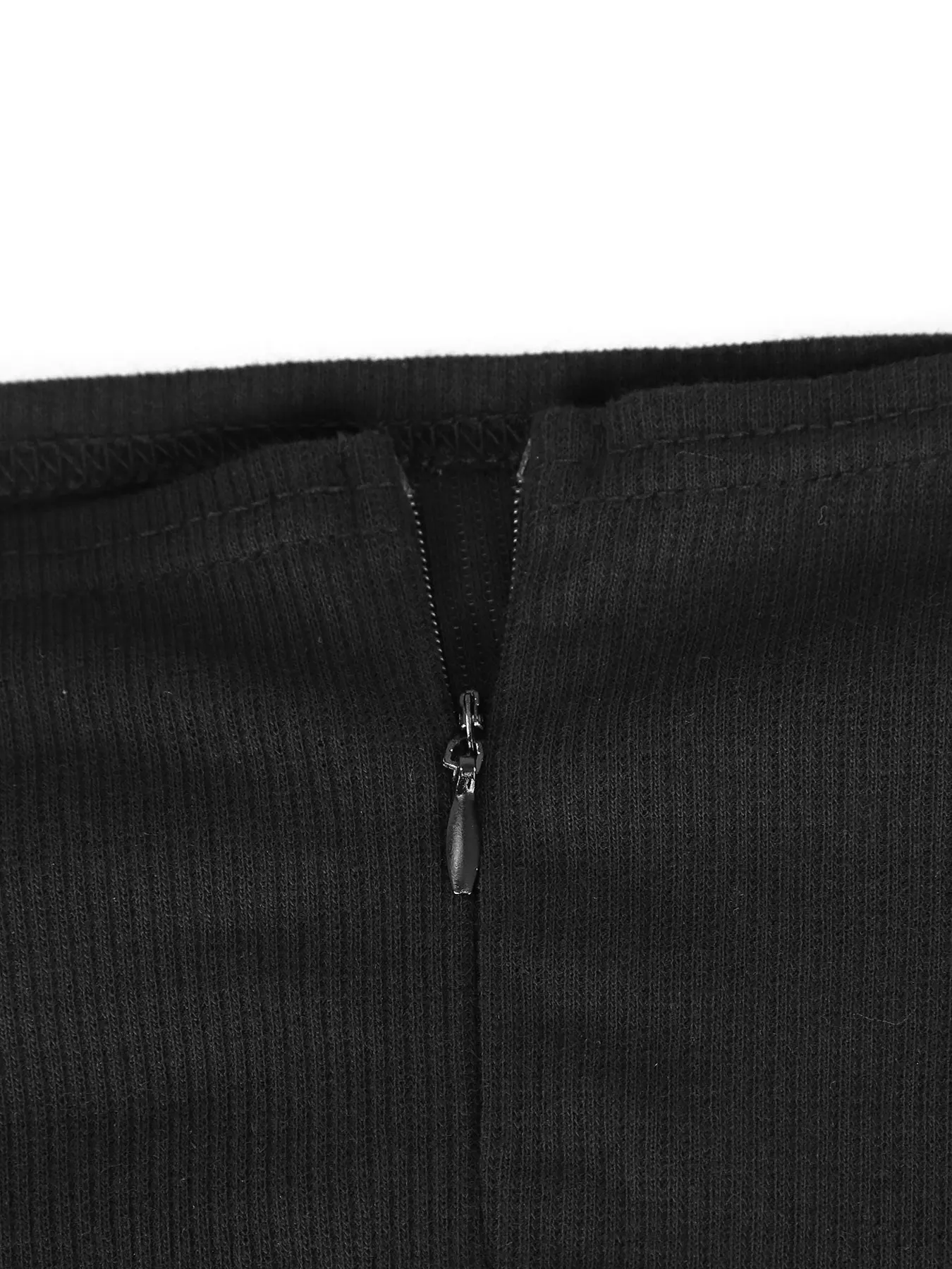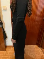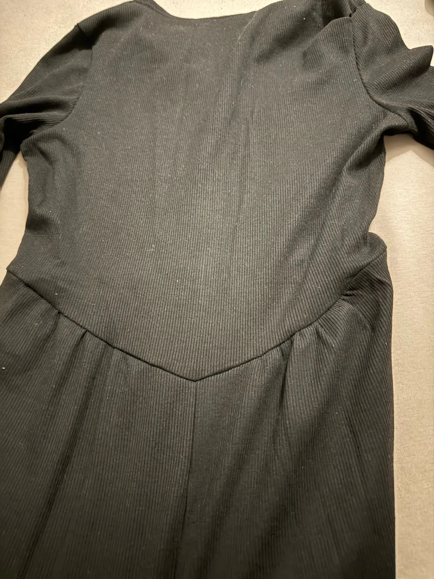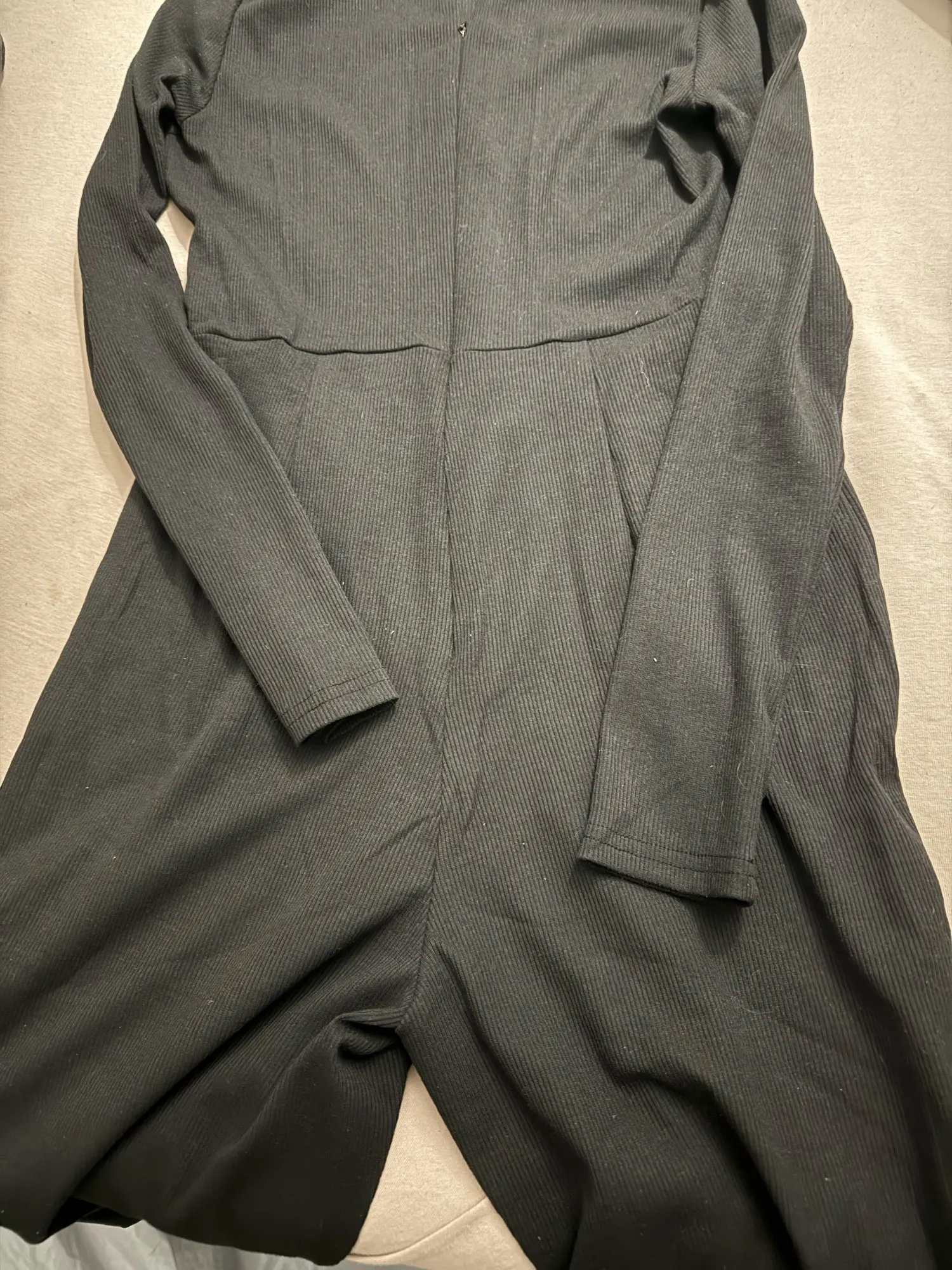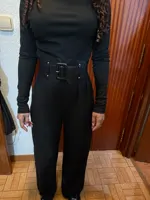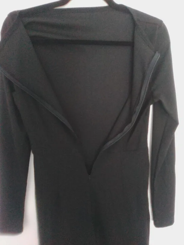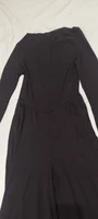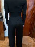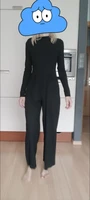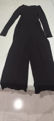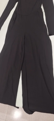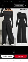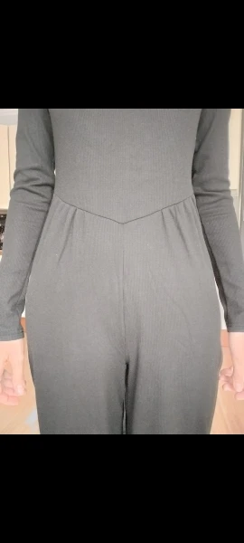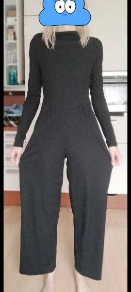From the tops, the material is stretchy, not transparent, has no unpleasant smell, has a well-functioning covered zipper on the back, pleasant to touch. What is an undeniable fact is that this is not a jumpsuit for someone who is 1.70 m tall; it’s for someone much shorter. I think it will look nice on someone about 160-165 cm tall and slightly heavier. At my height, it’s a bit too short; the shoulder line is also quite interesting; the asymmetrical sleeves are long and pleasant.