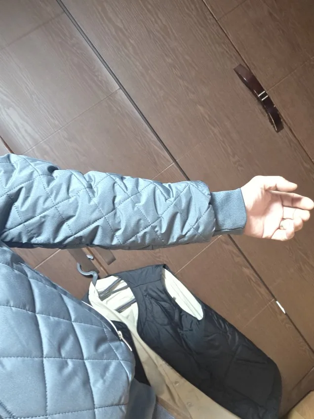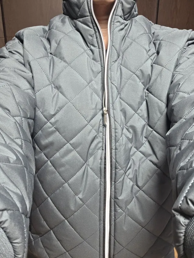 It’s quilted, so it looks a bit high-end, but there’s an error in the zipper area. Haha, I usually wear size 105, but I bought it about 2 sizes up. When I tried it on, it fit well, but the arm length was a bit disappointing for me.