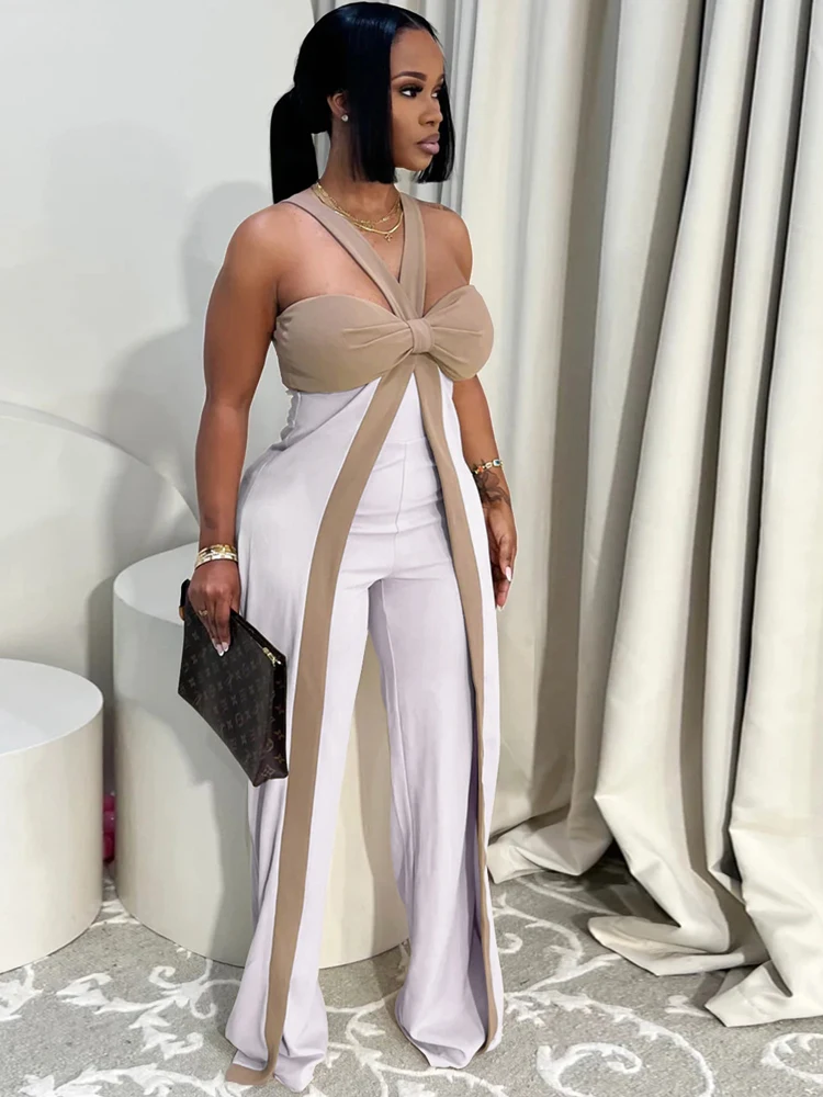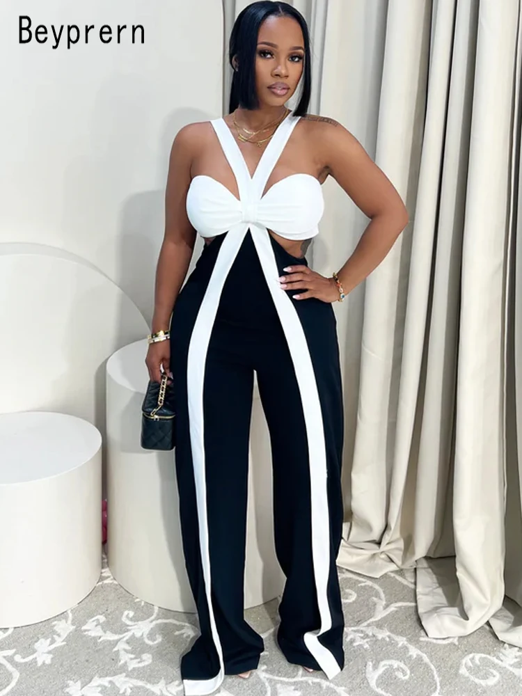 Beyprern Perfect Contrast Color Bow Tie Straps Jumpsuits Birthday Outfits Glam Womens Cut-Out Fitted Romper Night Out Overalls