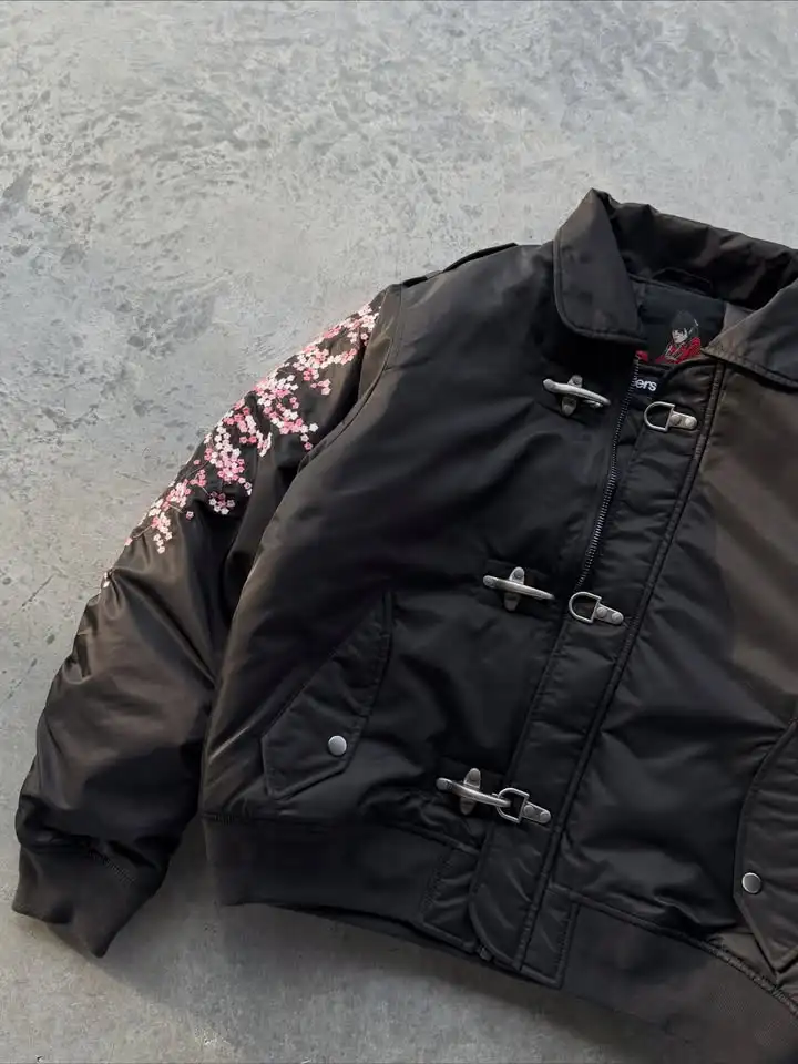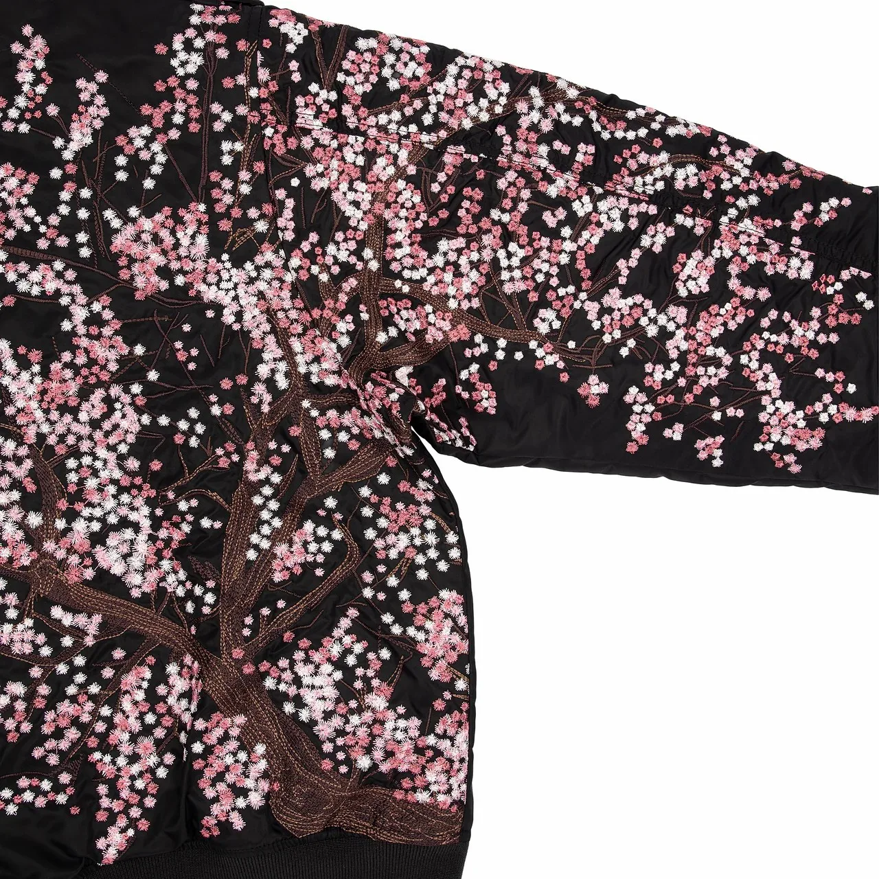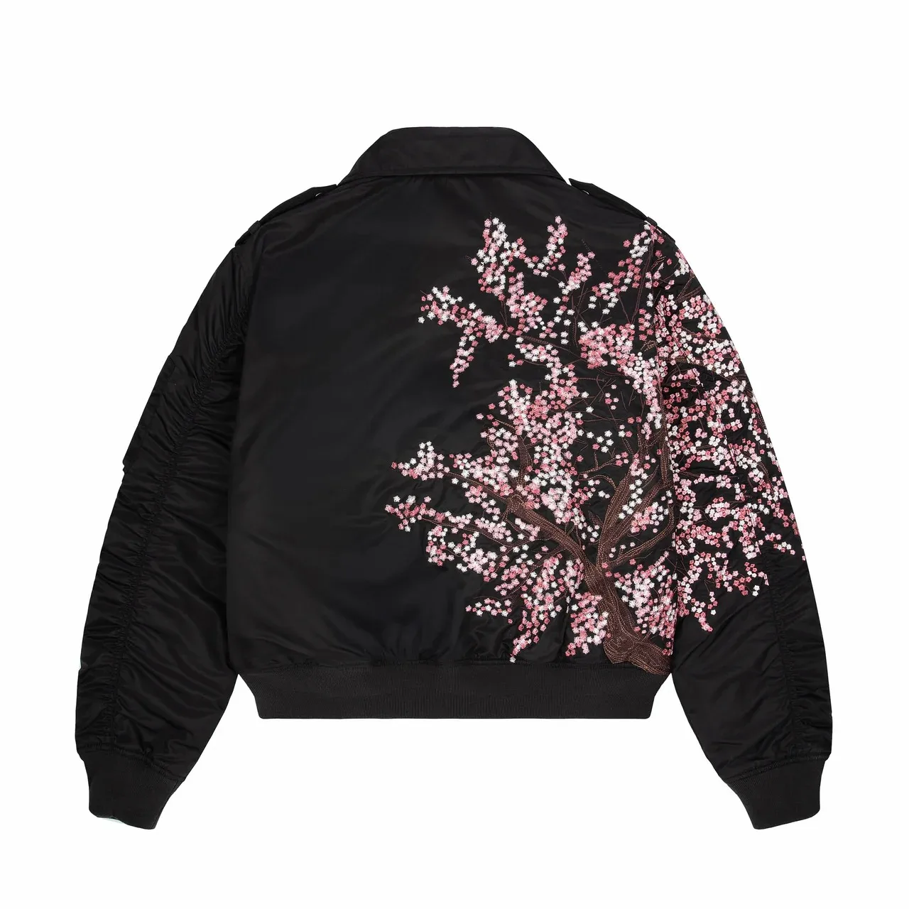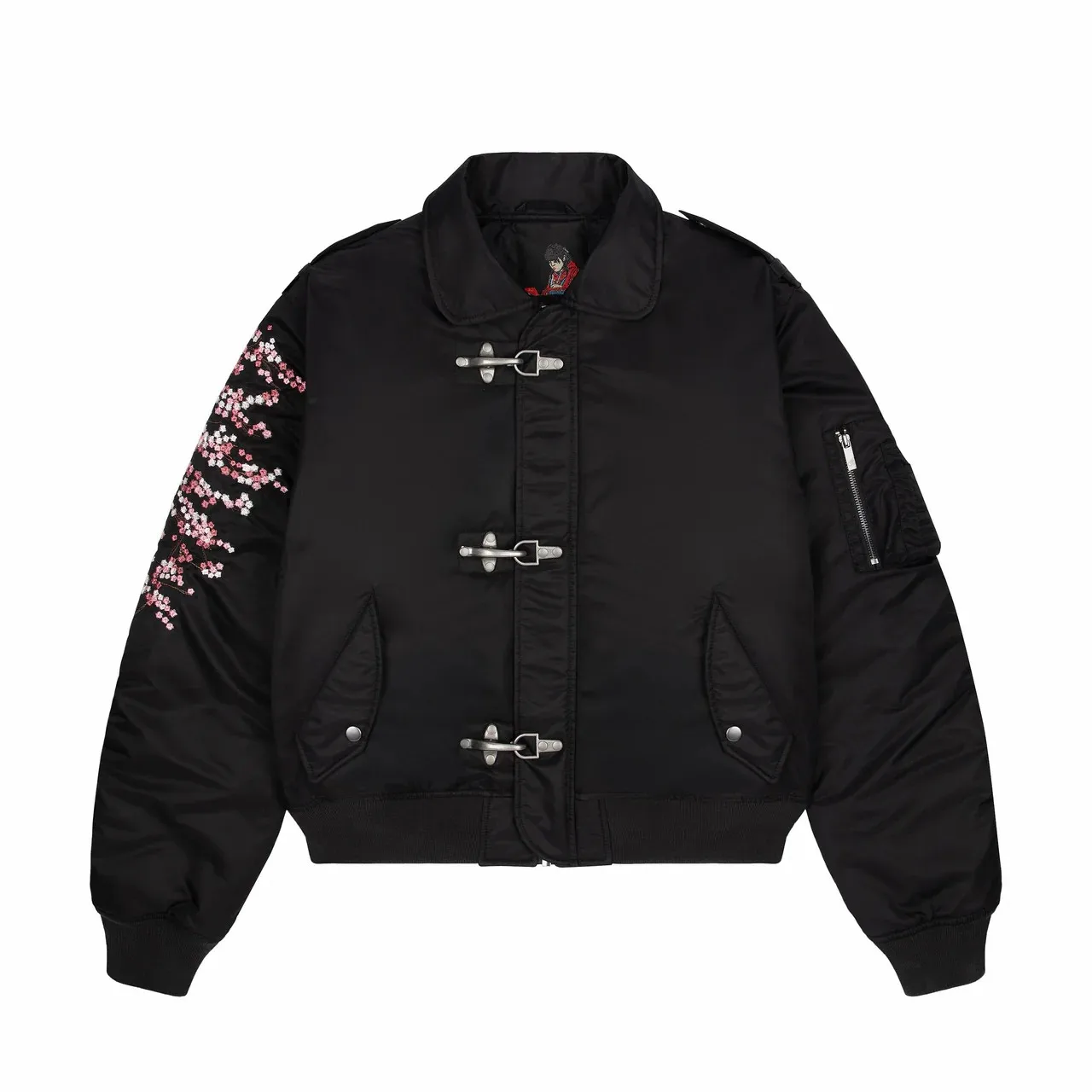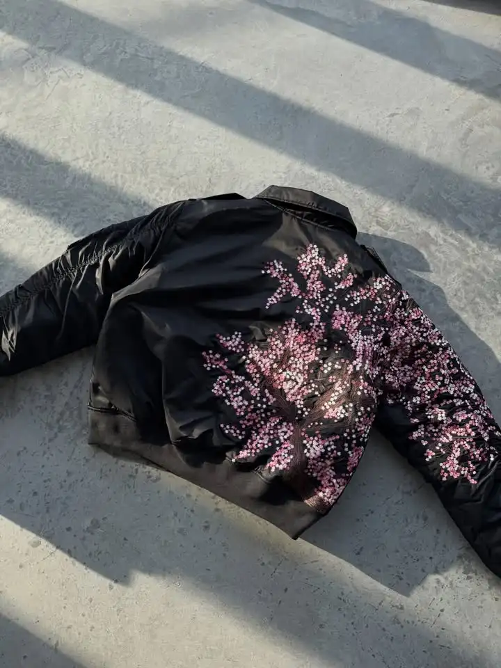 Stunning cherry blossom bomber! Pink flowers explode romantic magic on black, padded cozy hugs spring dream, petals scatter slay ethereal wild obsessed!