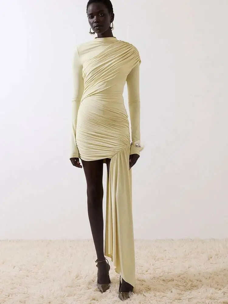4 reviews for Fantoye Irregular Long Sleeve Bandage Ruched Women Mini Dress Round Neck High Waist Dress Autumn New Elegant Party Evening Dress