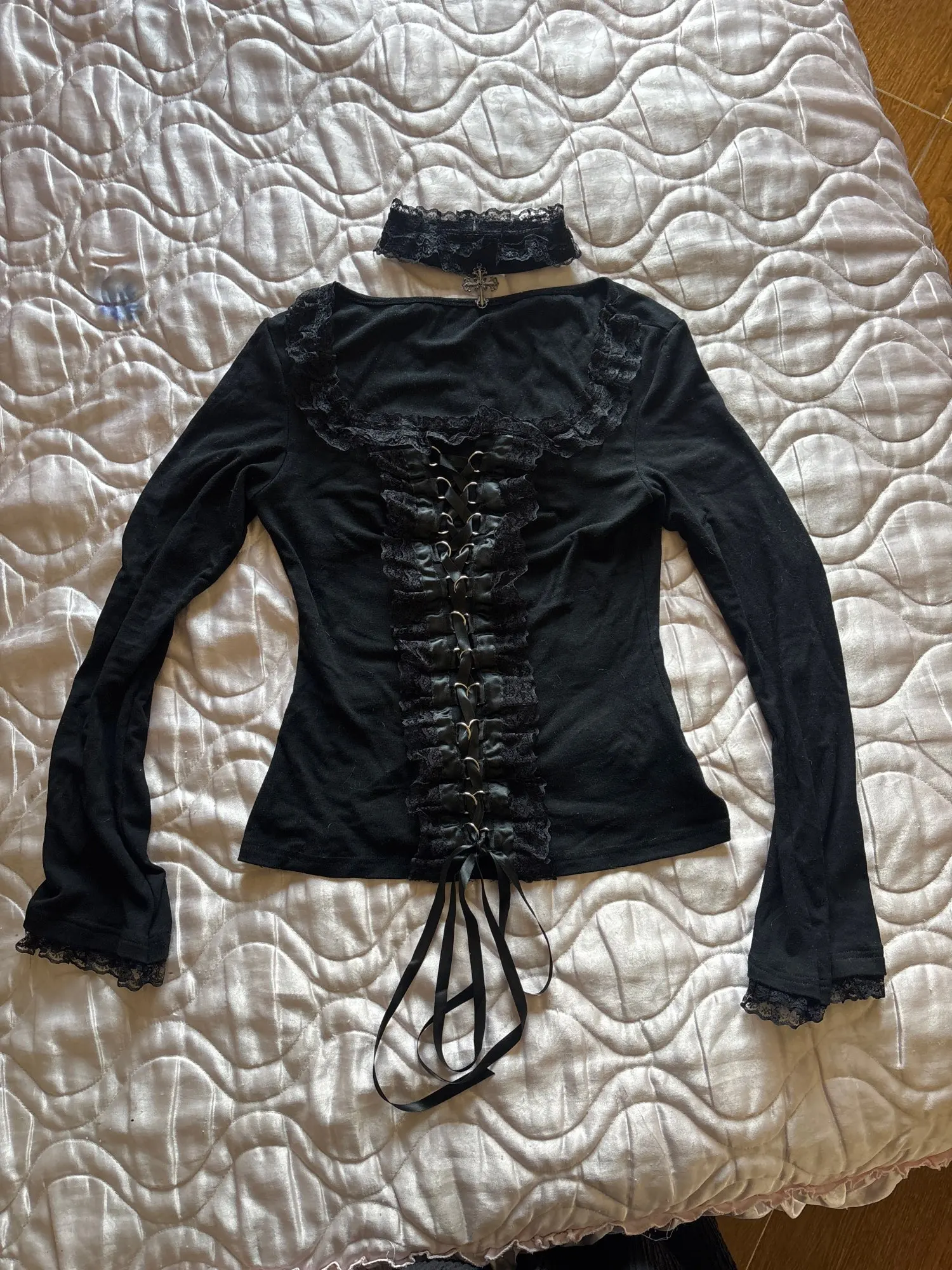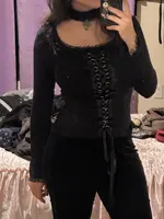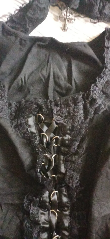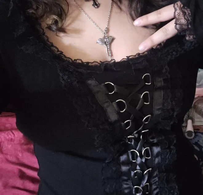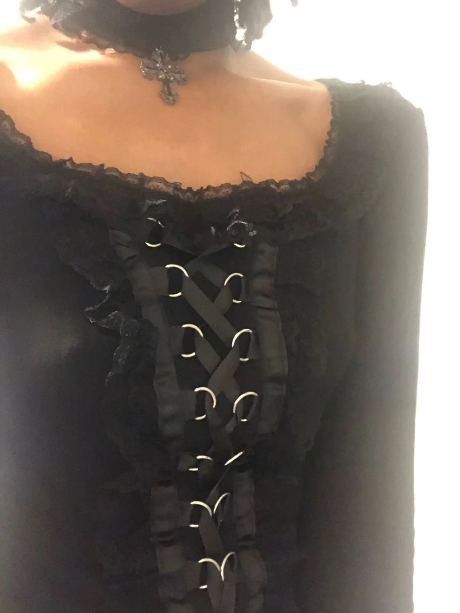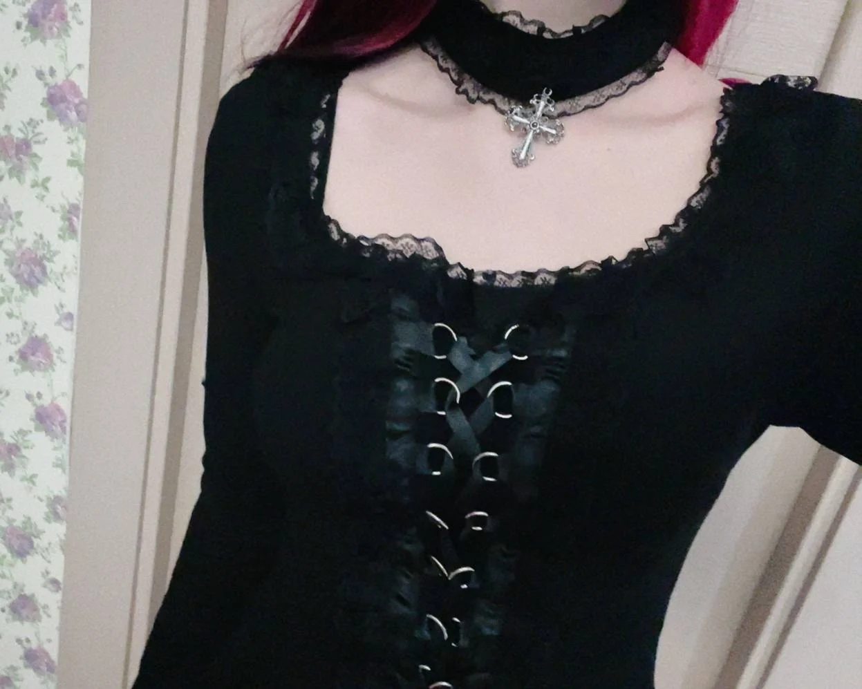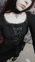 20 reviews for Goth Black Lace Trim Long Sleeve T-Shirts Vintage Sexy Lace-up Square Collar Tops with Choker Cross Women Autumn Tees