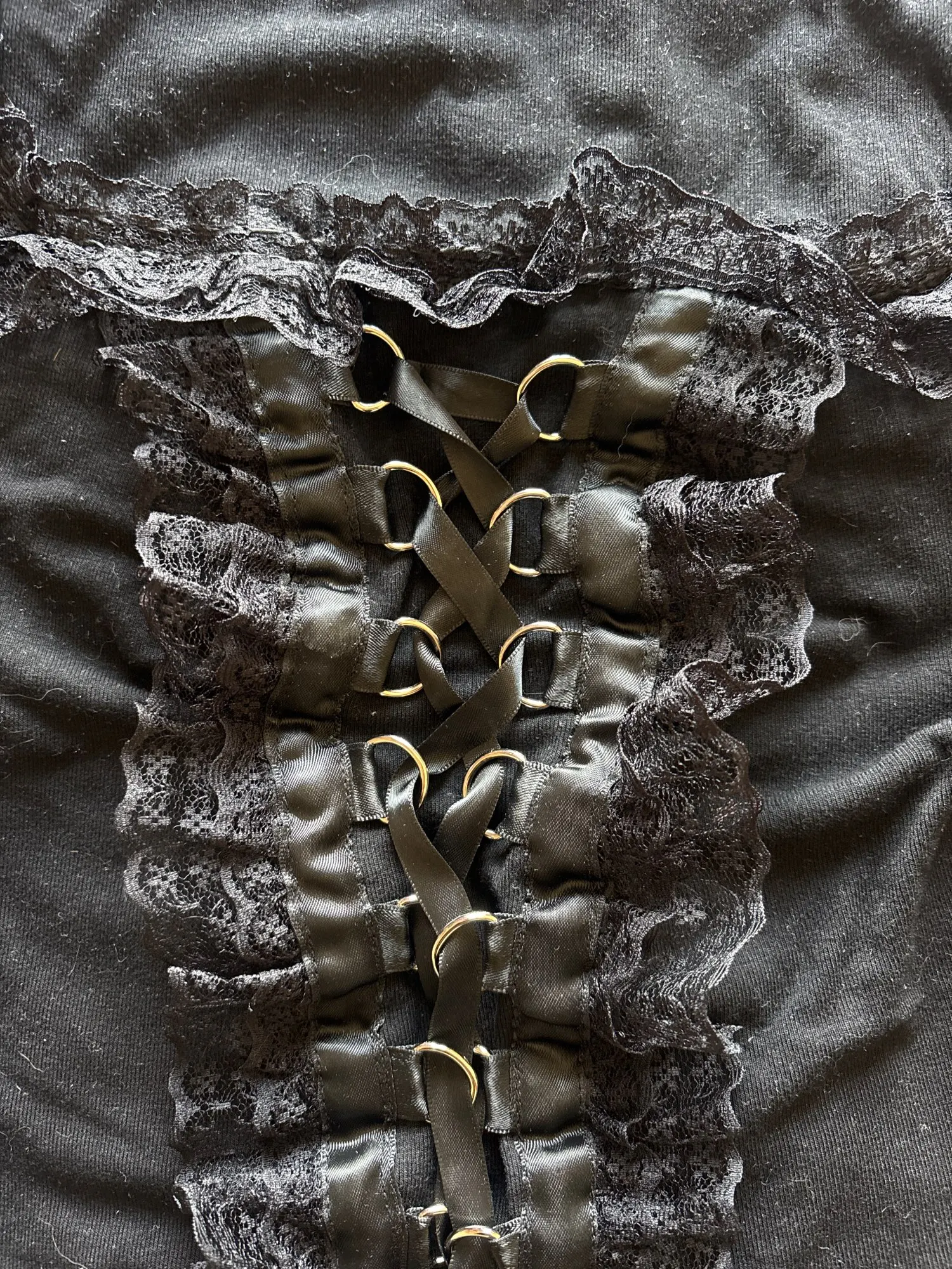 Goth Black Lace Trim Long Sleeve T-Shirts Vintage Sexy Lace-up Square Collar Tops with Choker Cross Women Autumn Tees