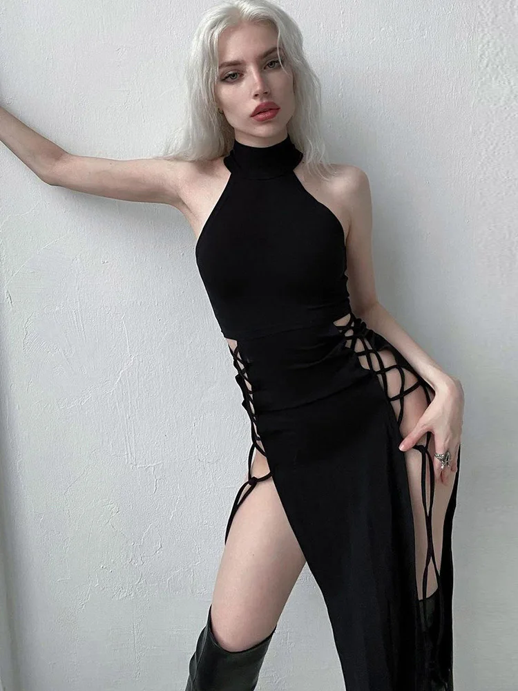 Goth Dark Cosplay High Split Sexy Bandage Women Dresses Y2K Mall Gothic Halter Slim Midi Dress Black Grunge Style Alt Partywear