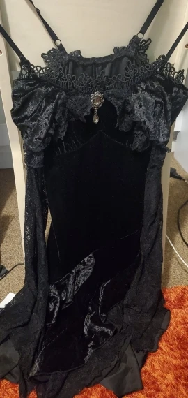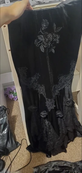 2 reviews for Goth Dark Flocking Lace Gothic Asymmetrical Maxi Dress Outfits for Women Mall Goth Embellished Off Shoulder Halloween Dresses