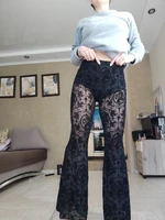 Goth Dark Vintage Flocking Mall Gothic Sexy Flare Pants Grunge See Through Mesh High Waist Women Trousers Punk Slim Alt Clothing