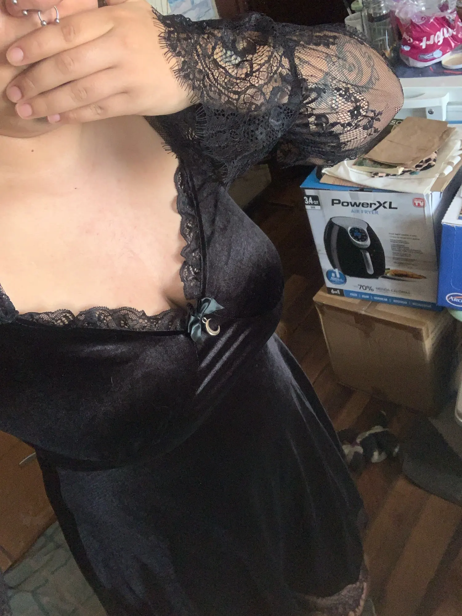 3 reviews for Gothic Lolita Girl Lace Trim Velvet A-Line Dress Women Sexy Perspective Long Sleeve V Neck Slim Mini Dress Cosplay Party Costume