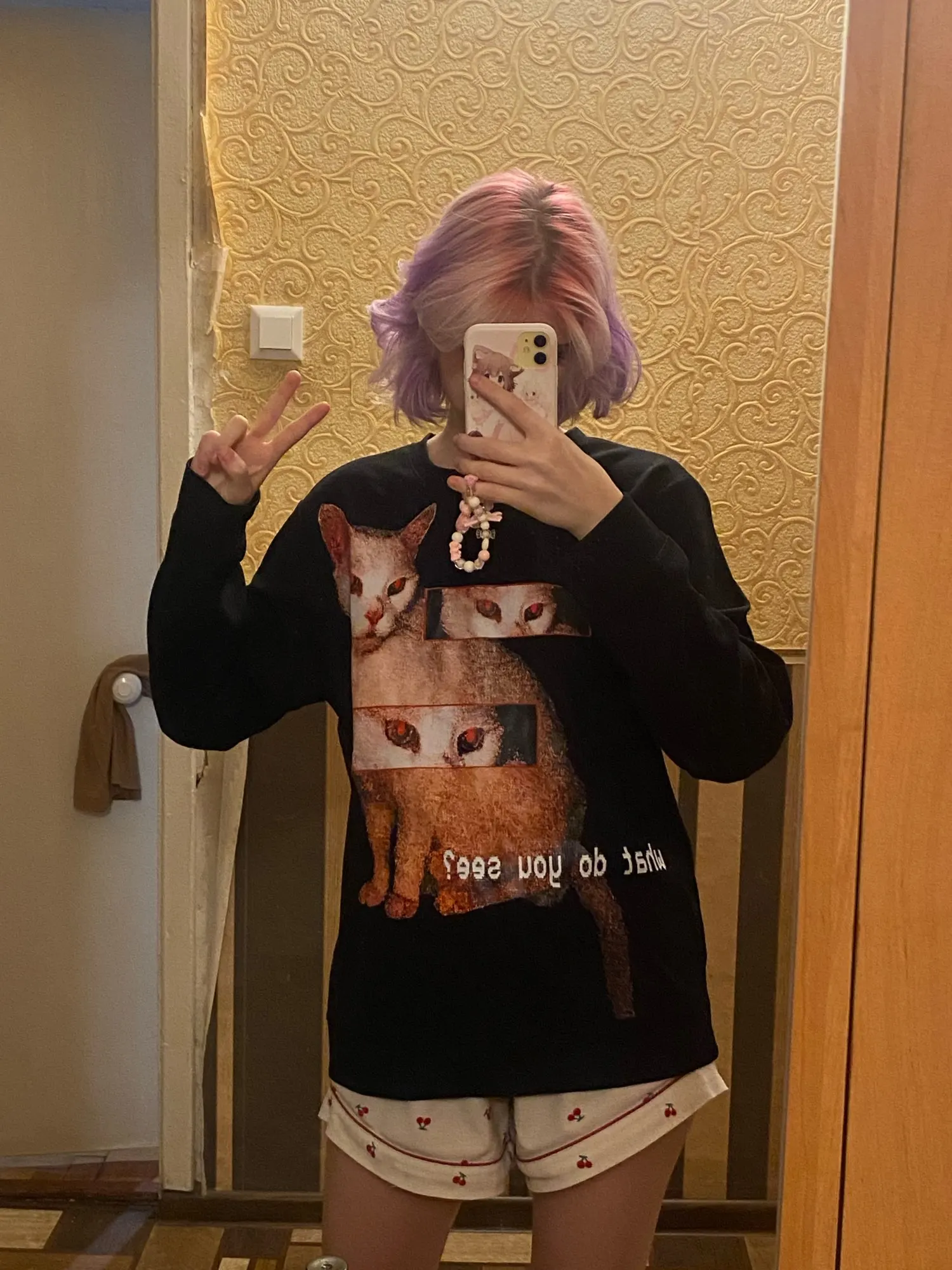 12 reviews for Harajuku Kawaii Cat Pattern Printed Long Sleeved T-shirt Y2K Gothic Fashion Round Neck Oversized Pullover Casual Streetwear