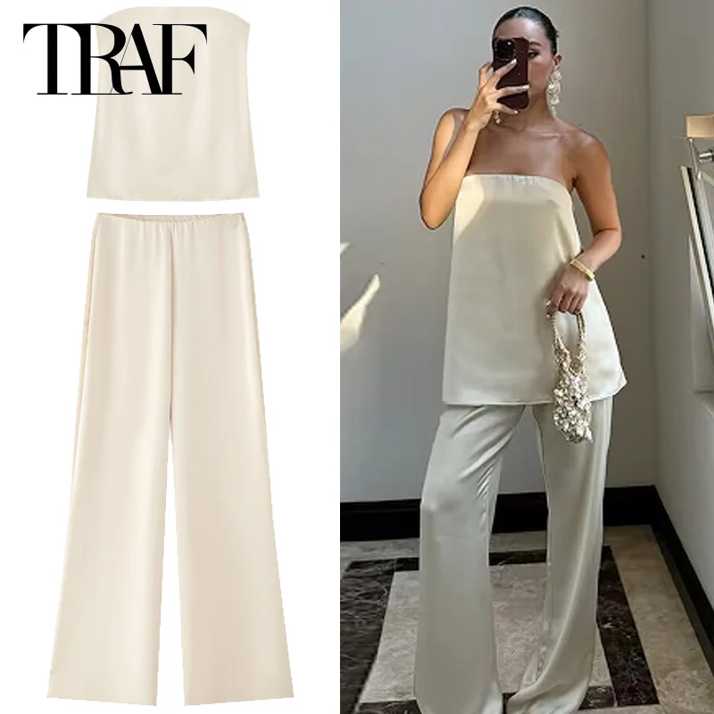 HXAO 2025 Off White Satin Pant Sets Women’s Suit Off Shoulder Strapless Top Vest Set 2 Piece Woman Chic High Waist Trousers Sets