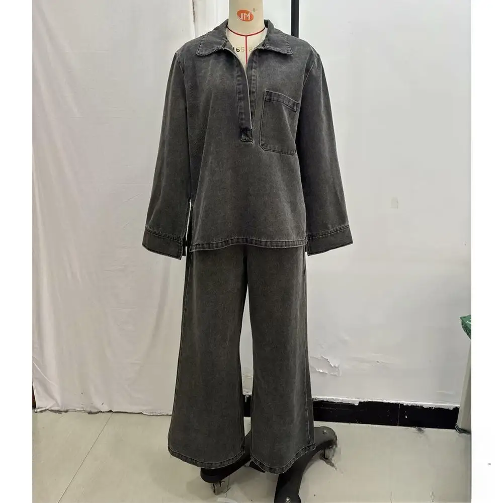 8 reviews for KONDALA Vintage Casual Denim Chic Women Suit V Neck Long Sleeve Tops+Elastic Straight Pants Fashion 2025 Fall Street Wear Sets
