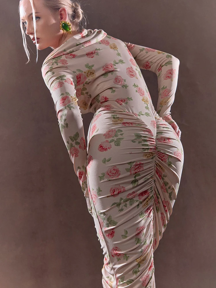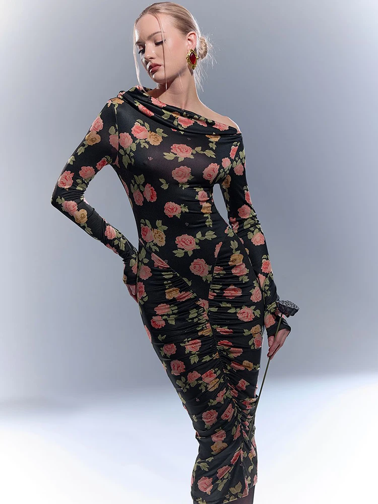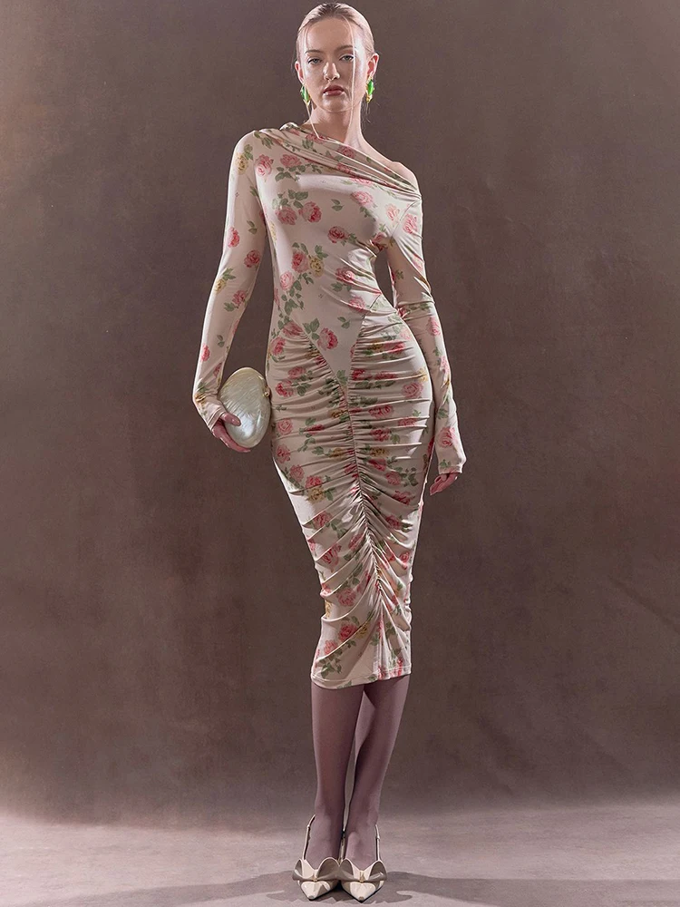 1 review for Mozision Diagonal Collar Long Sleeve Sexy Midi Dress Women Gown Elegant Backless Ruched Bodycon Club Party Long Dresses Female