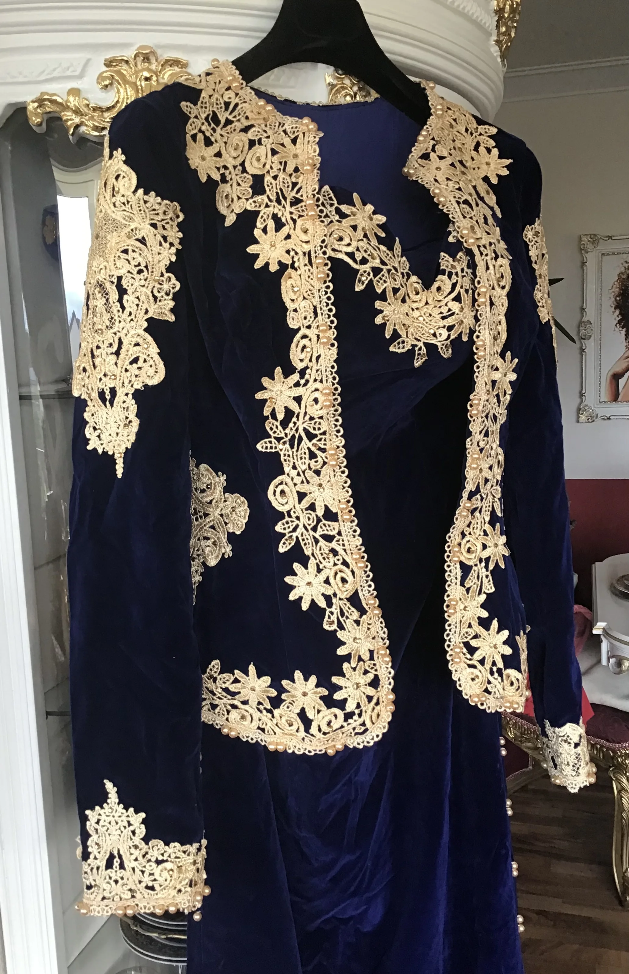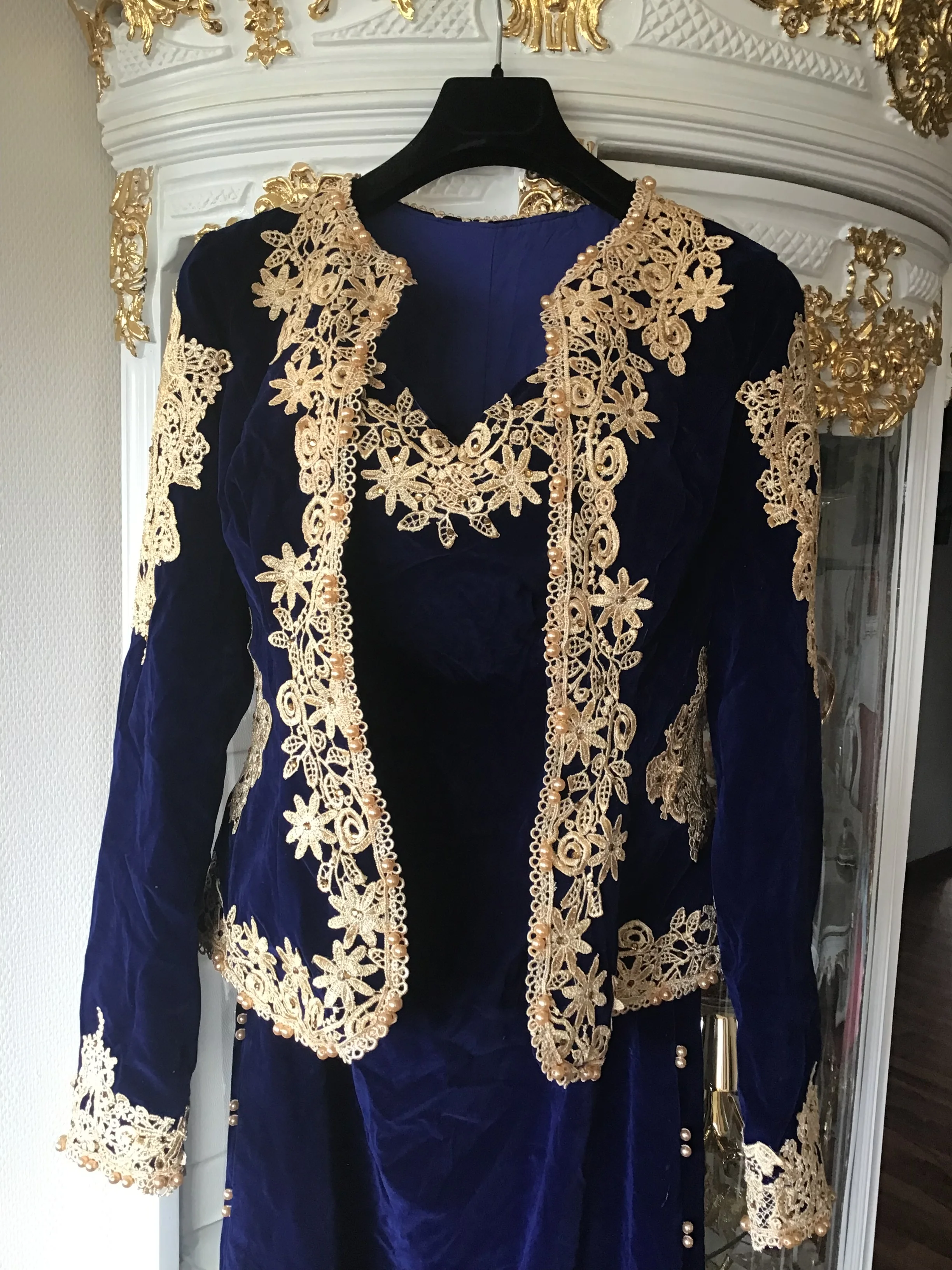 1 review for Royal Blue Velvet Prom Formal Dresses with Long Sleeve Jacket Customized Gold Lace Karakou Algerien Outfit Evening Occasion Gown
