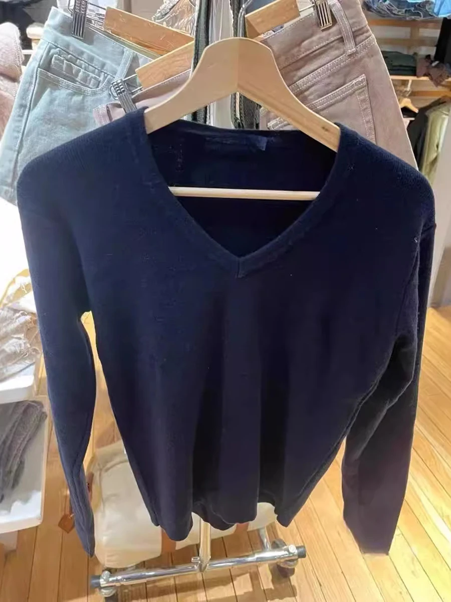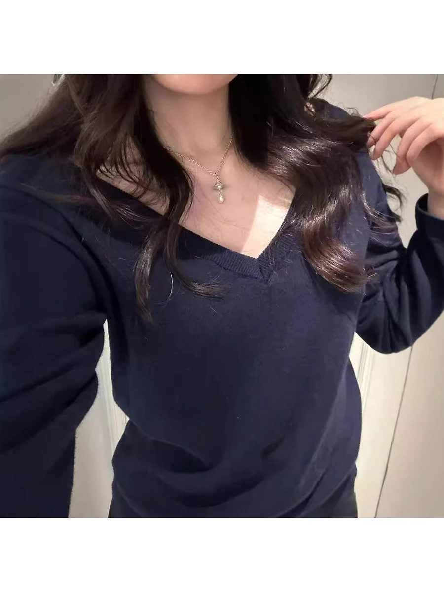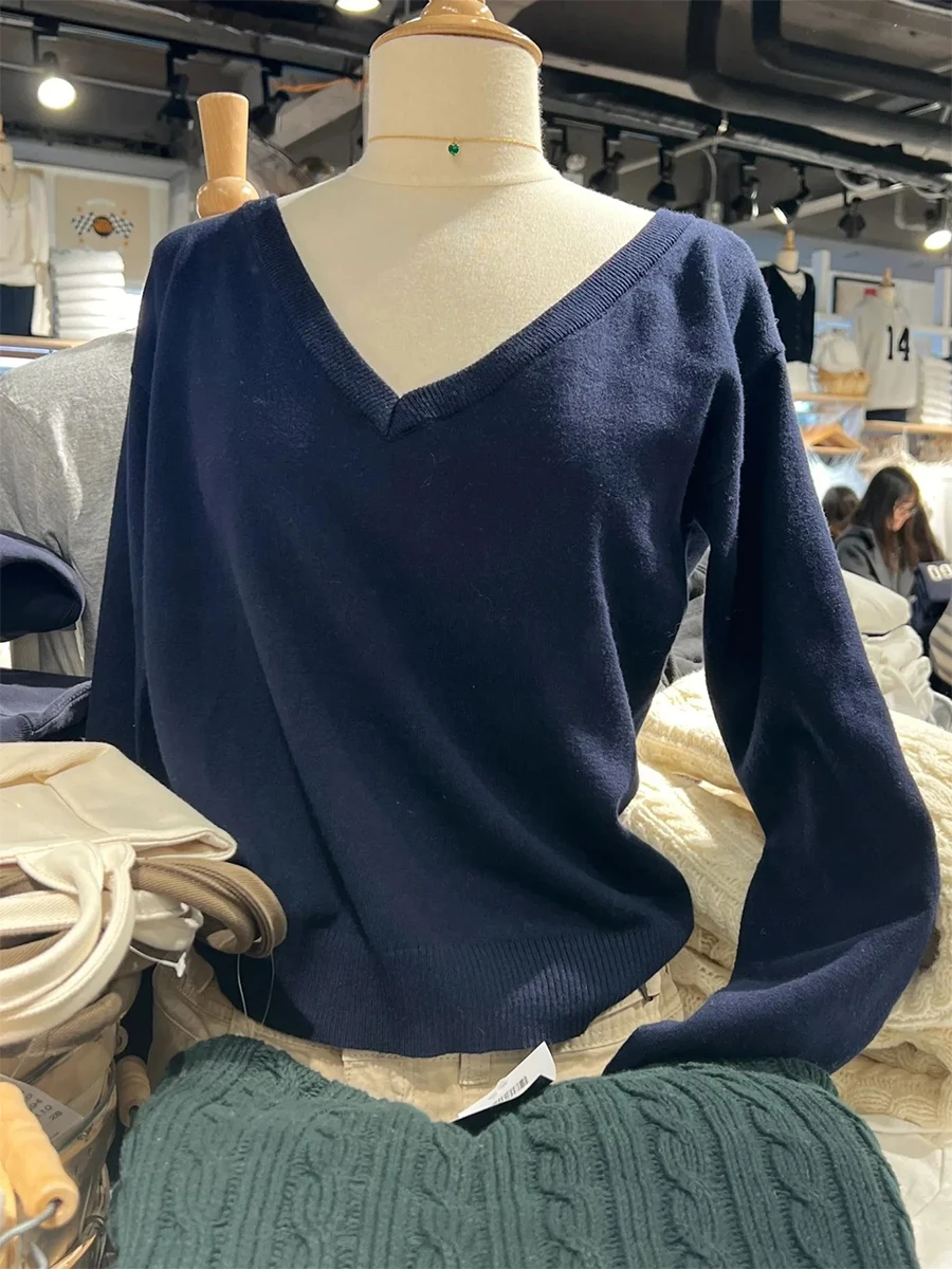 Solid V Neck Vintage Knitted Sweater Women Autumn Winter Cotton Long Sleeve Pullover Jumper Navy Simple Slim Streetwear Tops Y2k