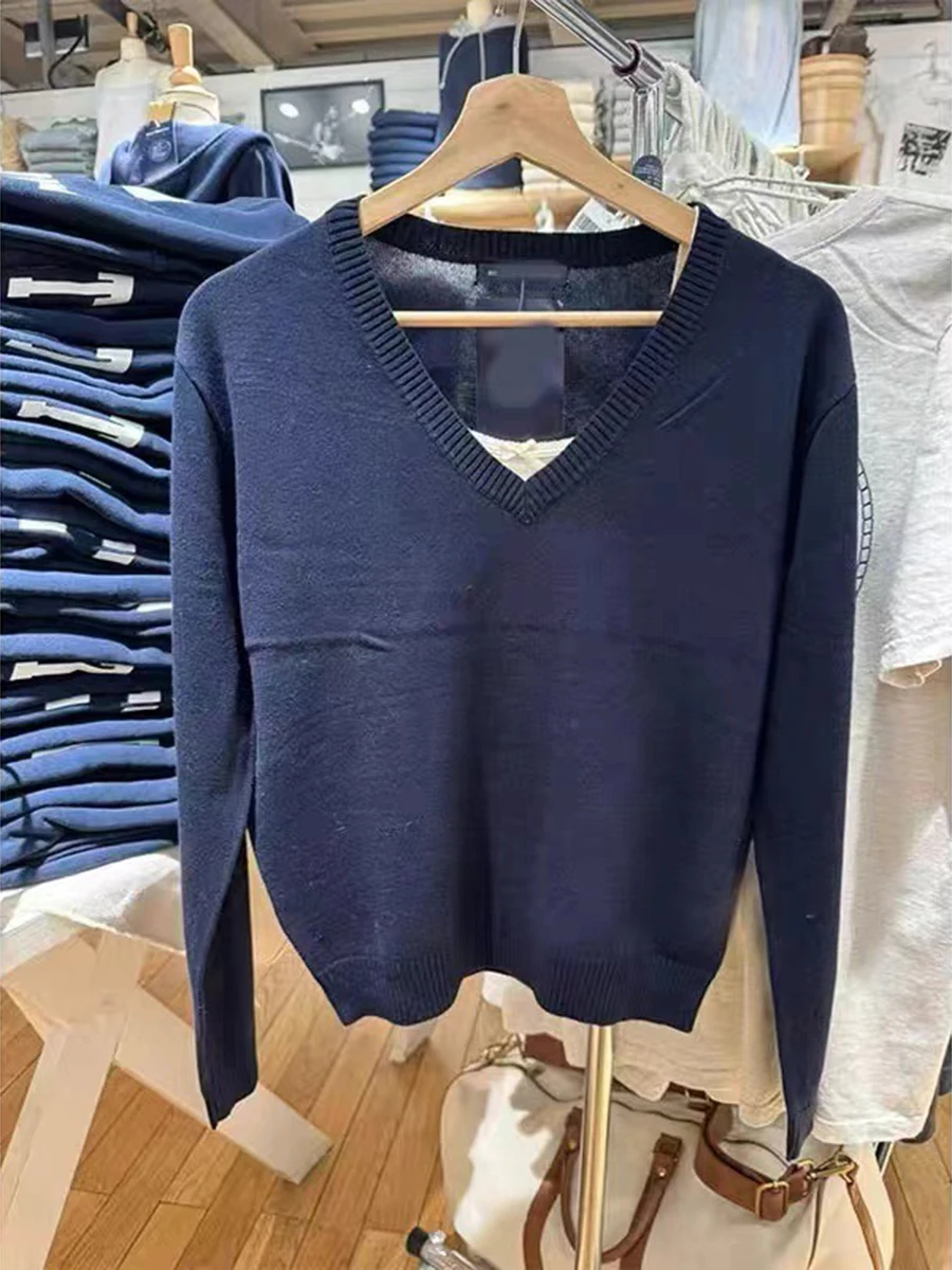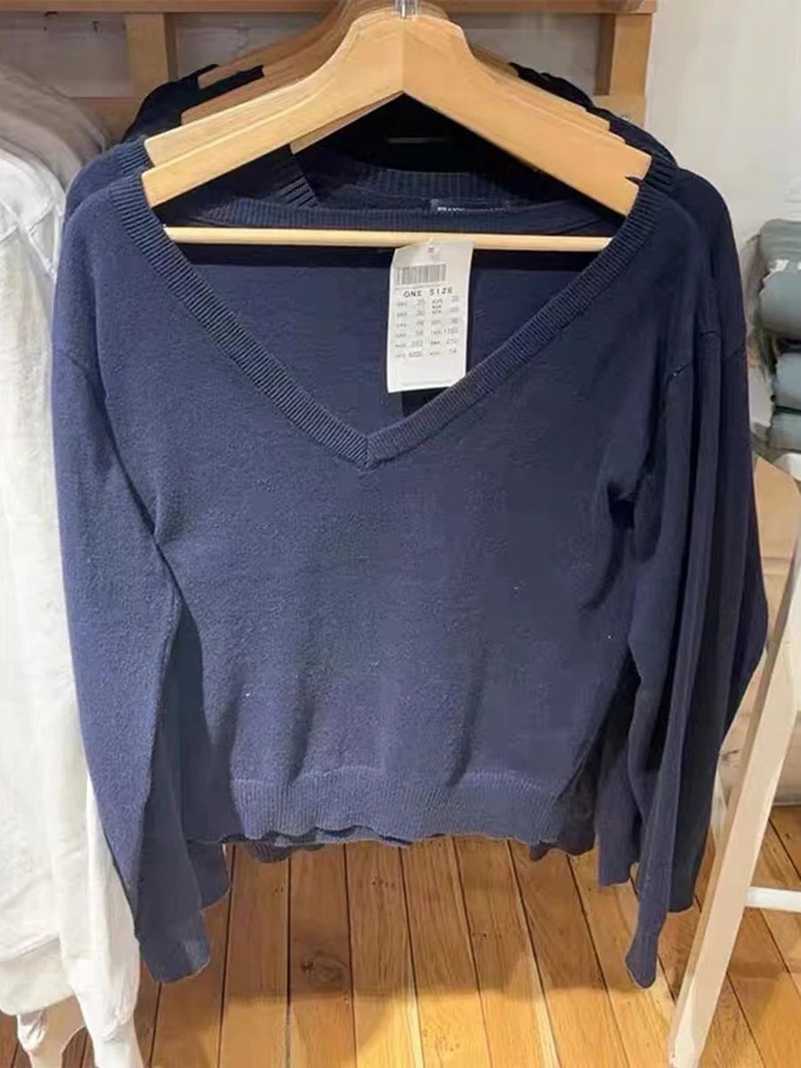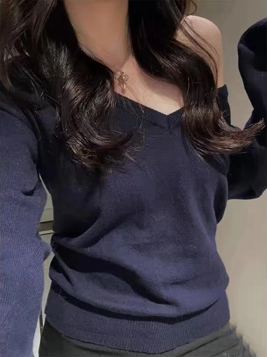 Solid V Neck Vintage Knitted Sweater Women Autumn Winter Cotton Long Sleeve Pullover Jumper Navy Simple Slim Streetwear Tops Y2k
