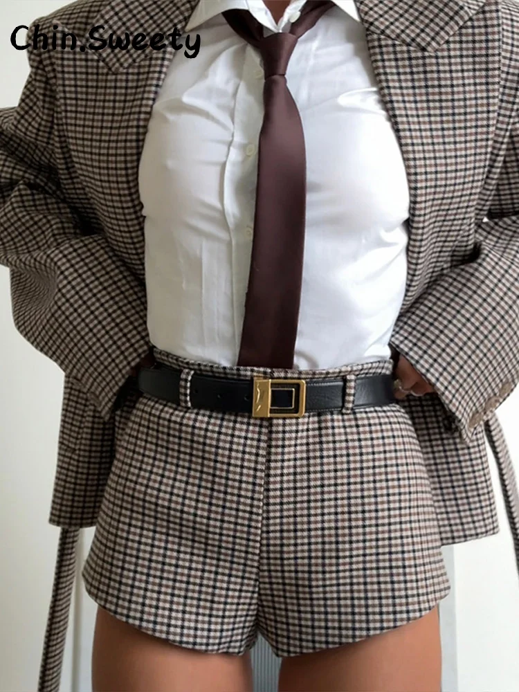 Street Women’s Lace Up Plaid Shorts Sets Loose Lapel Full Sleeve Single Breasted Jacket Short Pants 2025 Autumn Winter Lady Suit