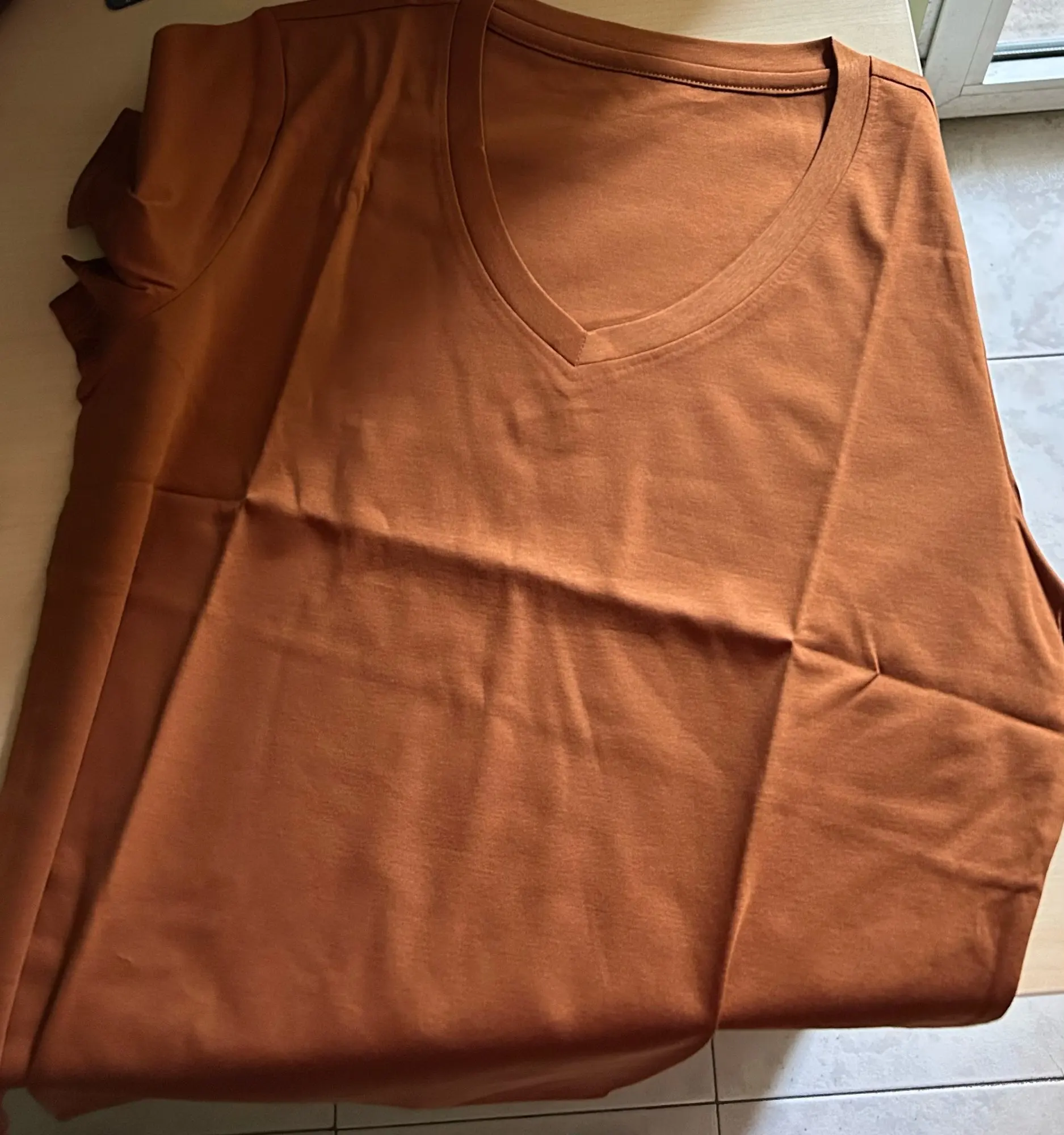T-shirt in very soft cotton but not thin, beautiful terracotta color as in the photo. I took size L and it corresponds to an European M. Great price with coin discount