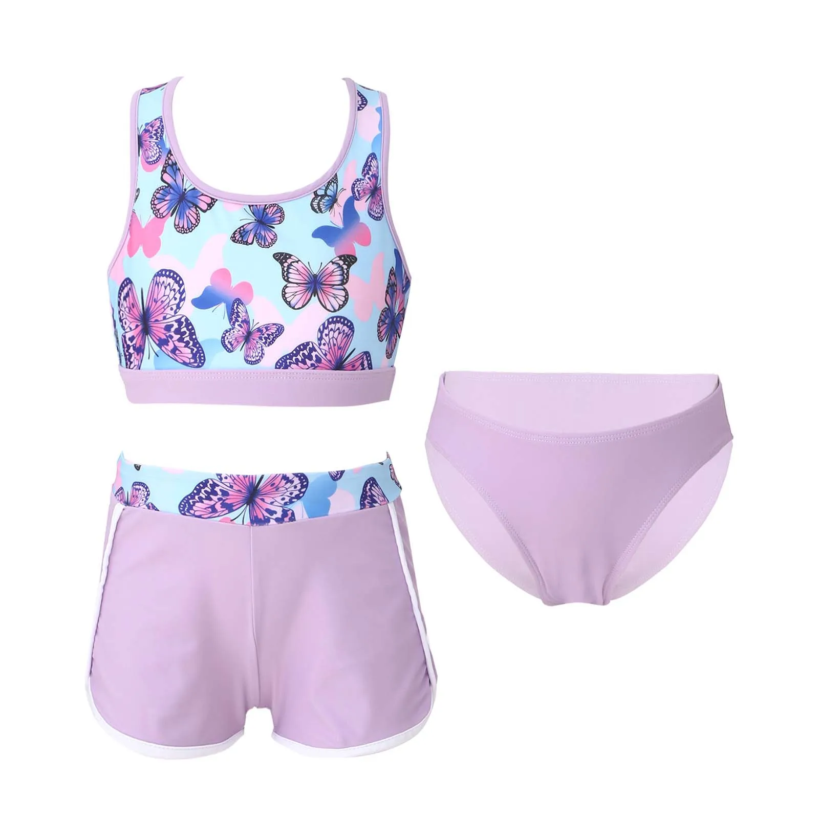 Toddler Girls Swimwear Swimsuit Rashguard Open Back Print Crop Tank Top with Shorts and Briefs Set 3Pcs Swimming Suits Beachwear