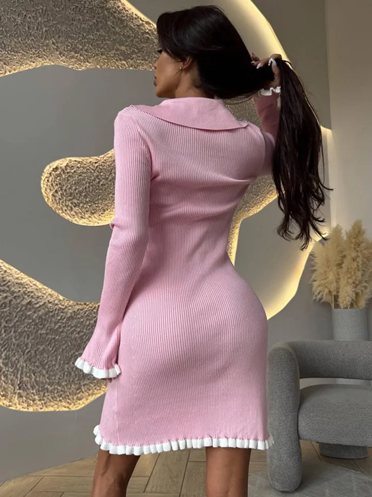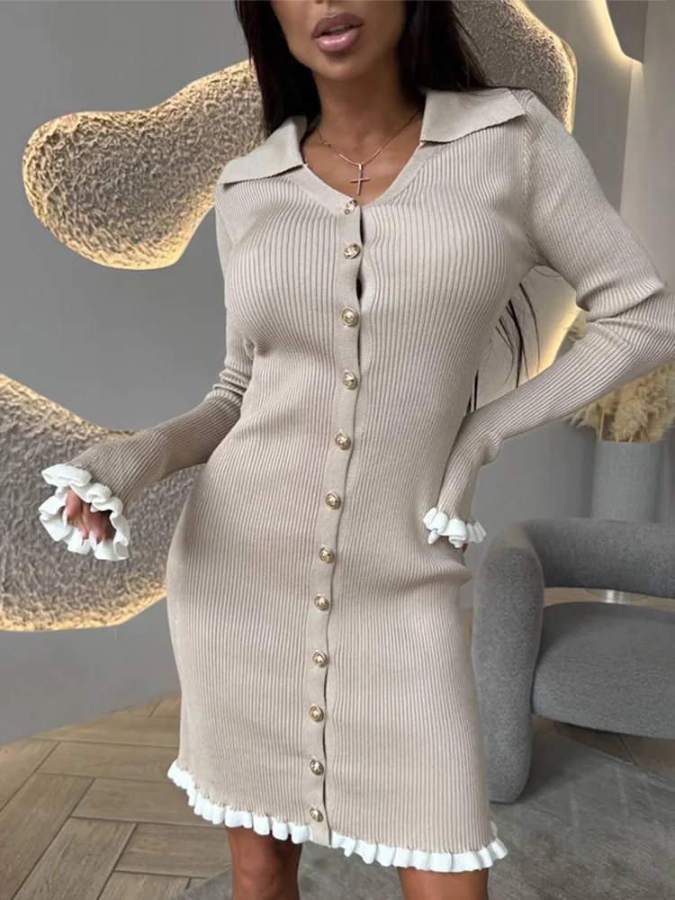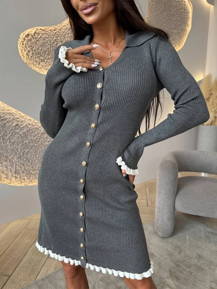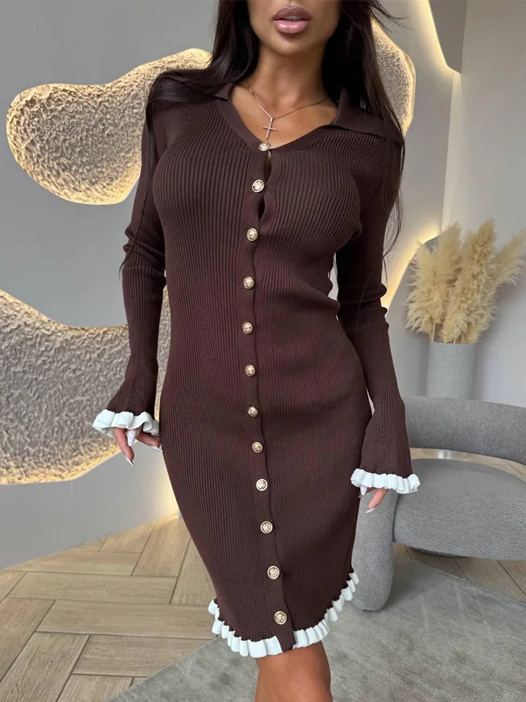 Trendix Ruffle Knitted Dress Women’s Autumn V Neck Patchwork Button Long Sleeve Dresses High Waist Knit Elegant Evening Dress