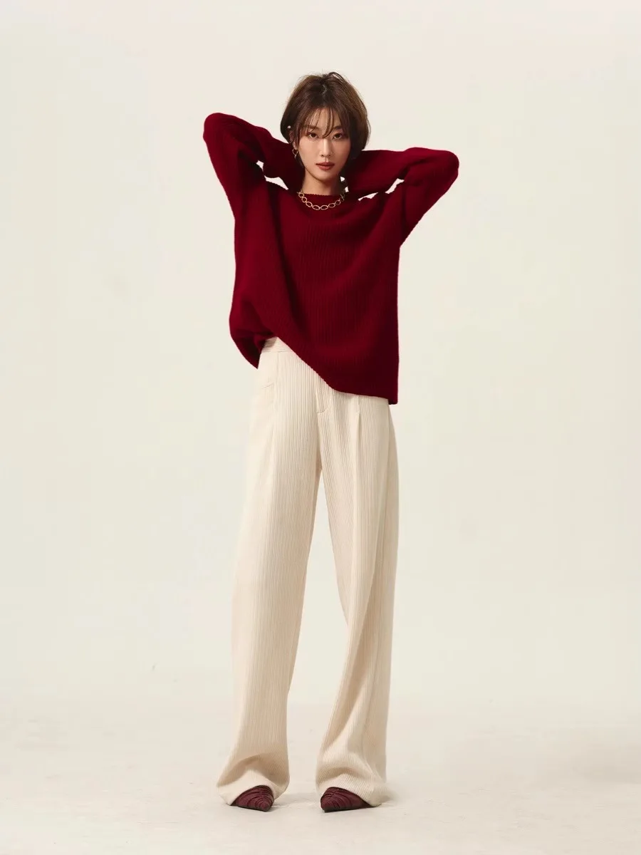 Turtleneck 100% cashmere sweater women loose thickening age reduction niche vintage red crewneck sweater women long sleeves