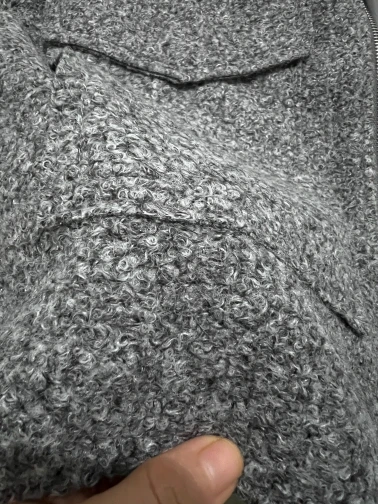 The beautiful jacket is of very good quality and finish. It doesn’t look like a cheap jacket. She is very well made and the fabric is good and warm. It doesn’t smell and the fabric is not rough.