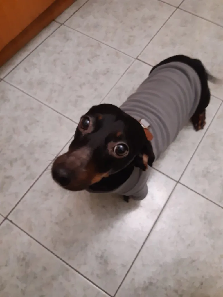 This is my second order of this dog outfit because the first time i ordered one size larger. It arrived on time again. It is exactly as described. The quality is good. I think the l size is the right size for our 8.7 kg dachshund.