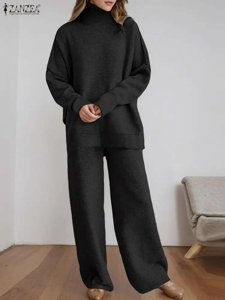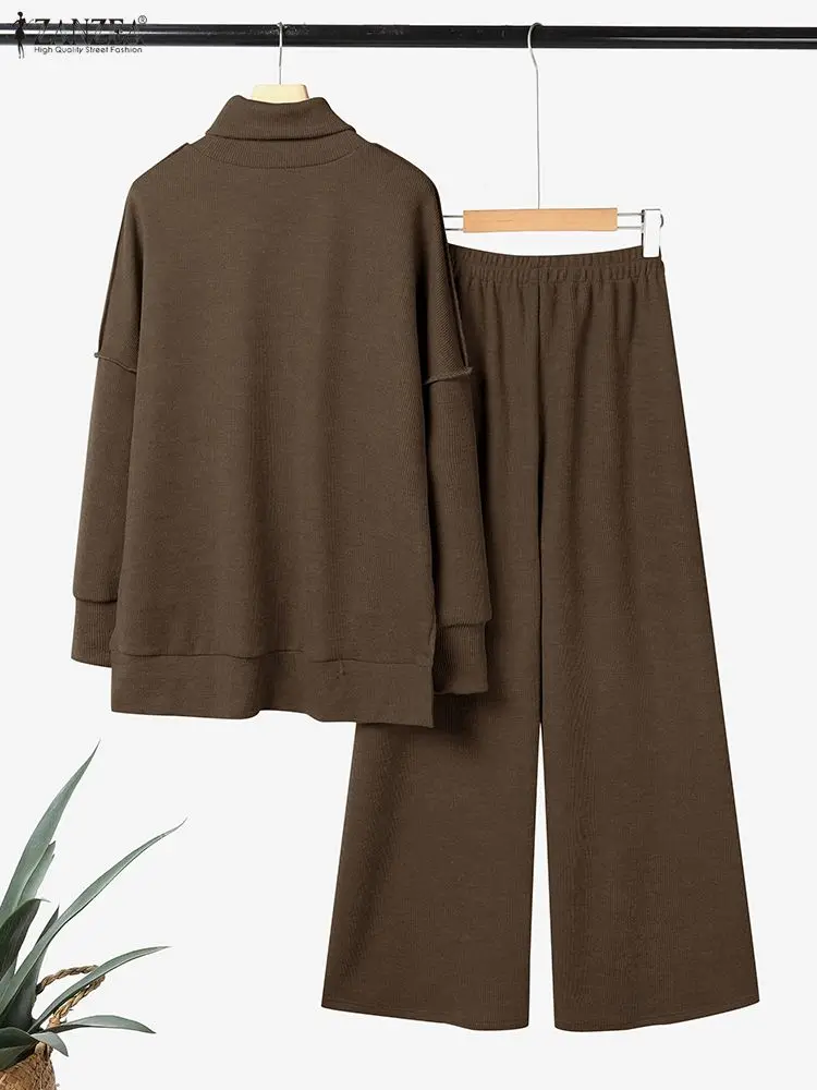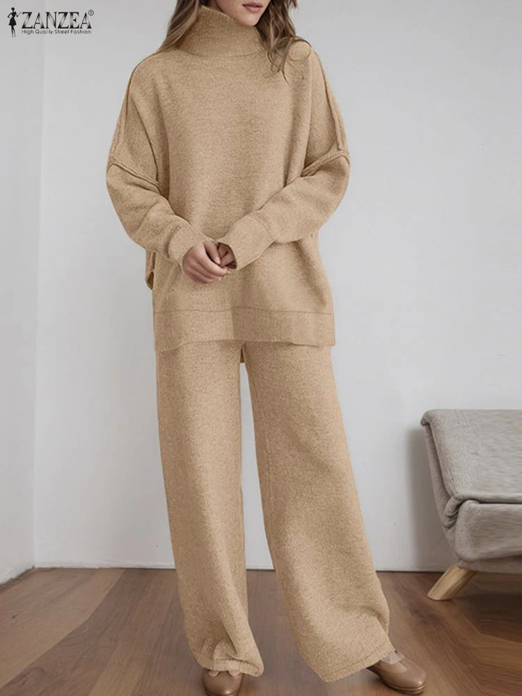 ZANZEA Women’s Knitted 2 Pieces Pant Sets Casual Loose Turtleneck Long Sleeve Pullovers and Wide Leg Pant Suits Daily Outfits